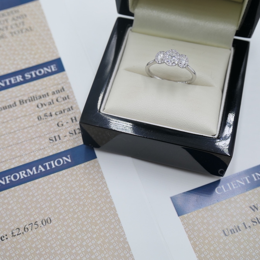 The total diamond weight is 0.54ct, with each diamond carefully selected for its clarity and remarkable brilliance. Graded SI1-SI2 for clarity and G-H for colour, the diamonds shine with exceptional fire and clarity, ensuring the ring catches the light beautifully. The oval-cut diamonds add sophistication and elegance, while the brilliant-cut diamonds in the halo create a dazzling effect, making this piece timeless and striking.