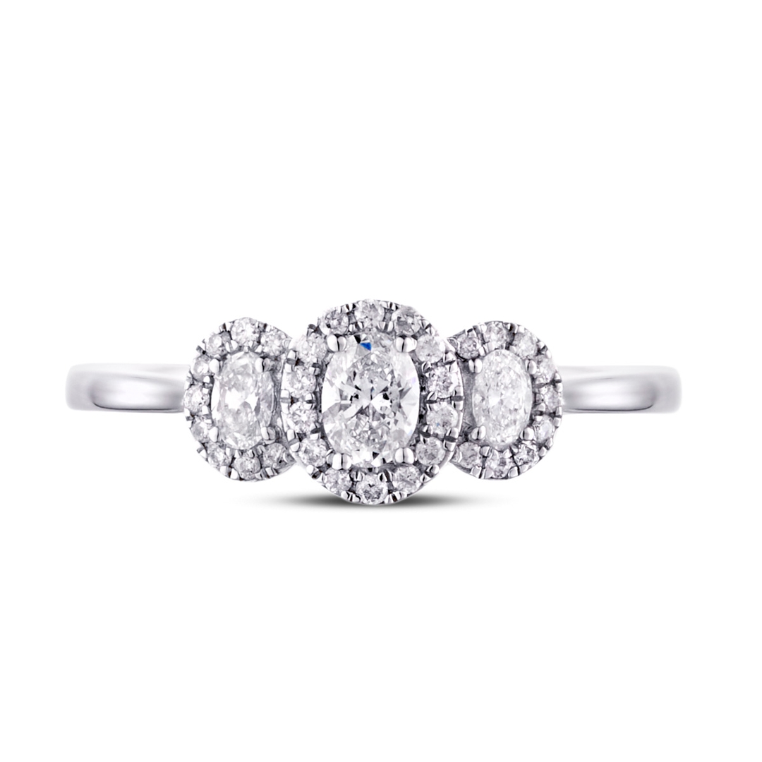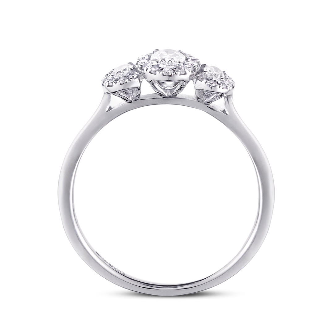A brand-new, unused, certified natural diamond oval-shaped trio cluster ring, exquisitely crafted in platinum. The design features three stunning oval-cut diamonds at the centre, radiating with natural brilliance and balance. Surrounding these are clusters of brilliant-cut diamonds in an elegant halo setting, enhancing the sparkle and adding depth to the overall composition. With a total diamond weight of 0.54ct, graded G–H in colour and SI1–SI2 in clarity, this ring showcases a beautiful harmony between precision craftsmanship and timeless design.
