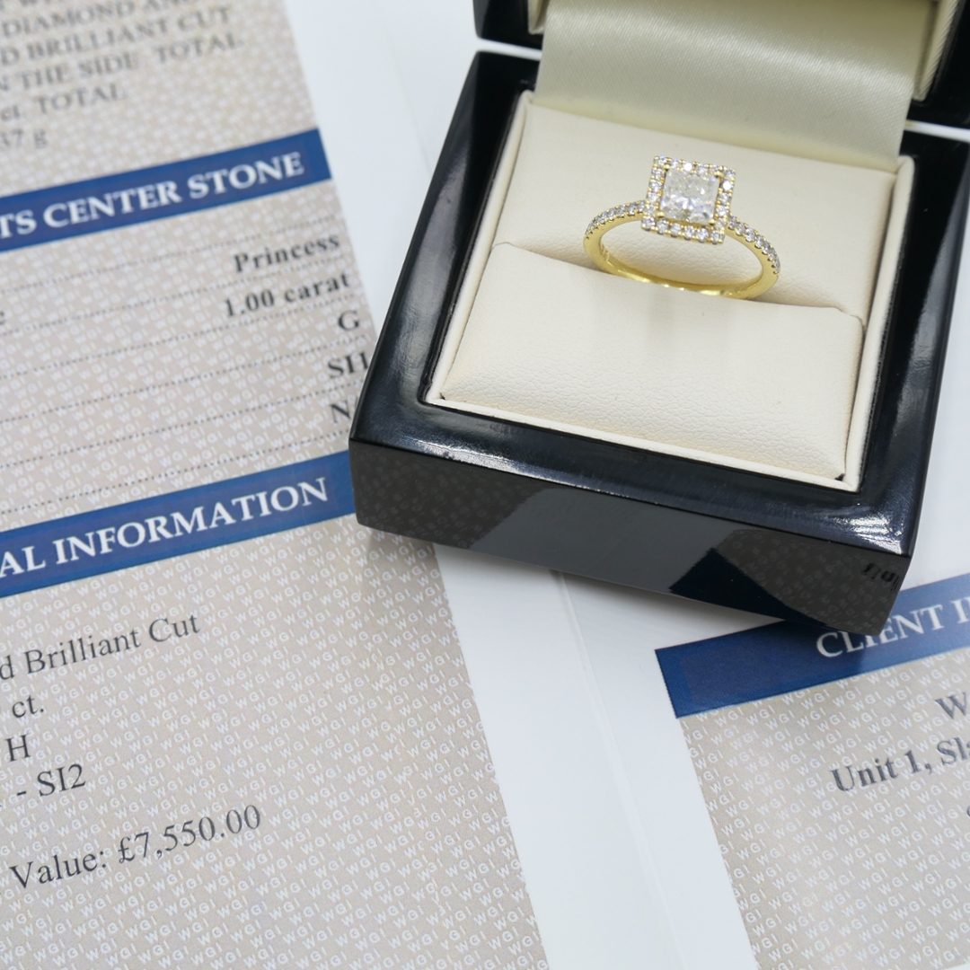 A brand-new, unused, certified natural diamond solitaire engagement ring, this breathtaking piece captures elegance and romance in perfect harmony. At its centre rests a dazzling 1.00-carat princess-cut diamond, graded G in colour and SI1 in clarity, radiating exceptional brilliance and fire. Surrounding the centre stone is a glittering halo of brilliant-cut diamonds, with additional diamonds adorning the shoulders for a seamless flow of sparkle and sophistication. These accent stones total 0.39 carats, graded G–H in colour and SI1–SI2 in clarity, beautifully enhancing the central diamond's allure.