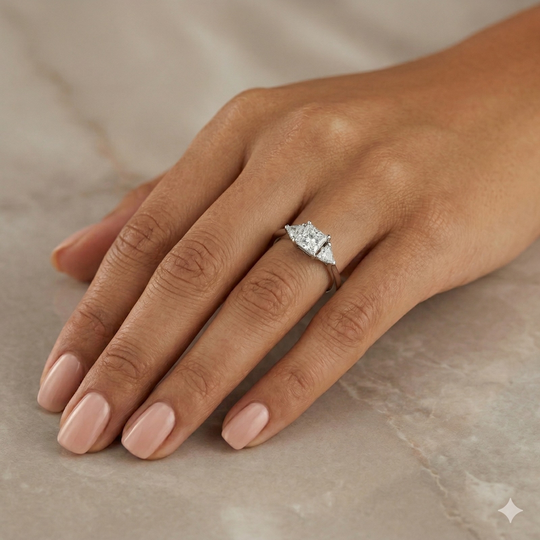 A brand new, unused, certified natural diamond solitaire engagement ring, with a princess-cut diamond at the centre & two trillion-cut diamonds on the sides, set in 18ct white gold.
