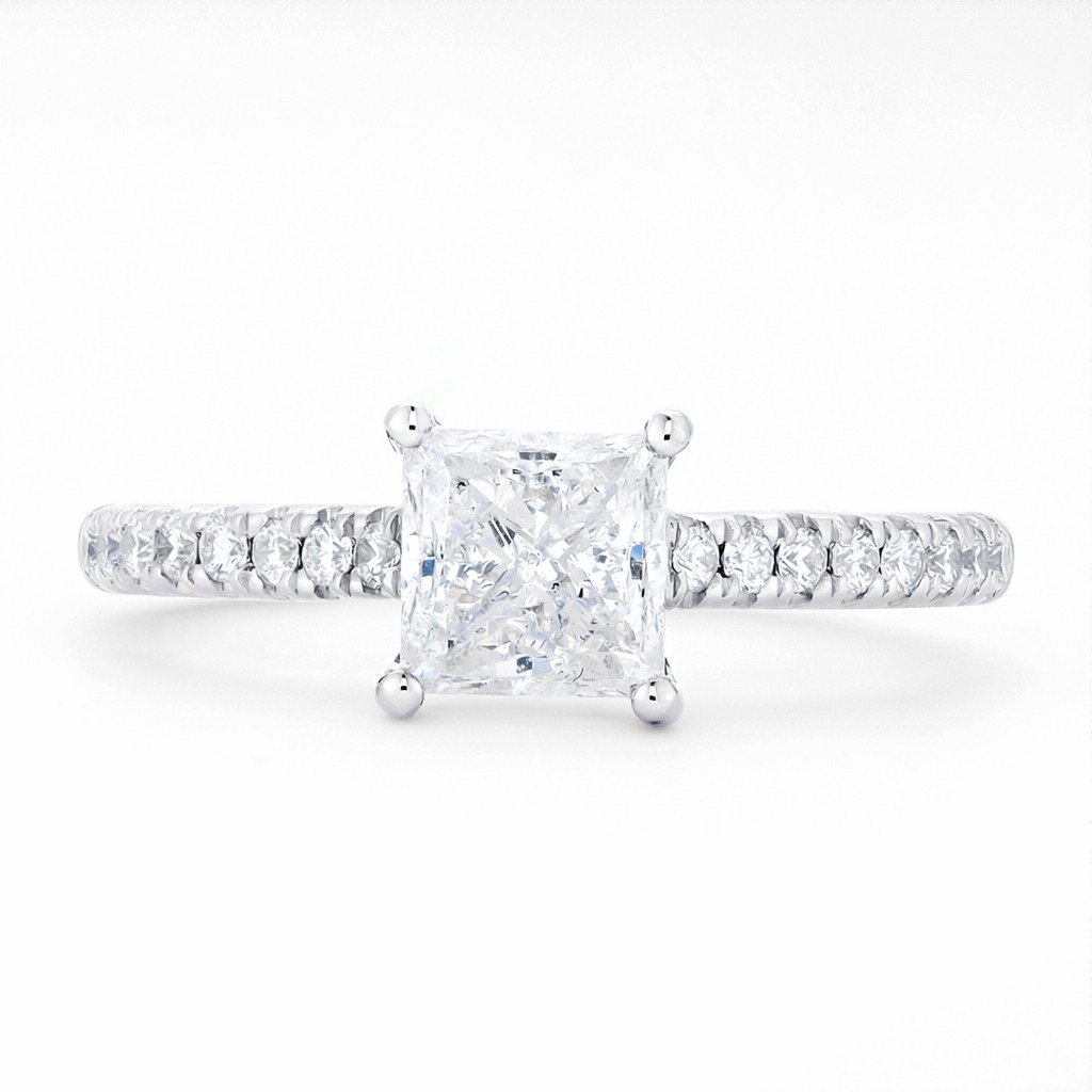 A brand-new, unused certified 18ct white gold engagement ring, this exquisite piece is a stunning blend of timeless elegance and enduring value. A dazzling 1.50ct princess-cut natural diamond is at its centre, radiating brilliance with SI2 clarity and G colour. Flawlessly complemented by a cluster of brilliant-cut diamonds along the shoulders, with a total weight of 0.19ct, these accent diamonds boast exceptional VS1-VS2 clarity and F-G colour. Together, they create a breathtaking display of light and sparkle.