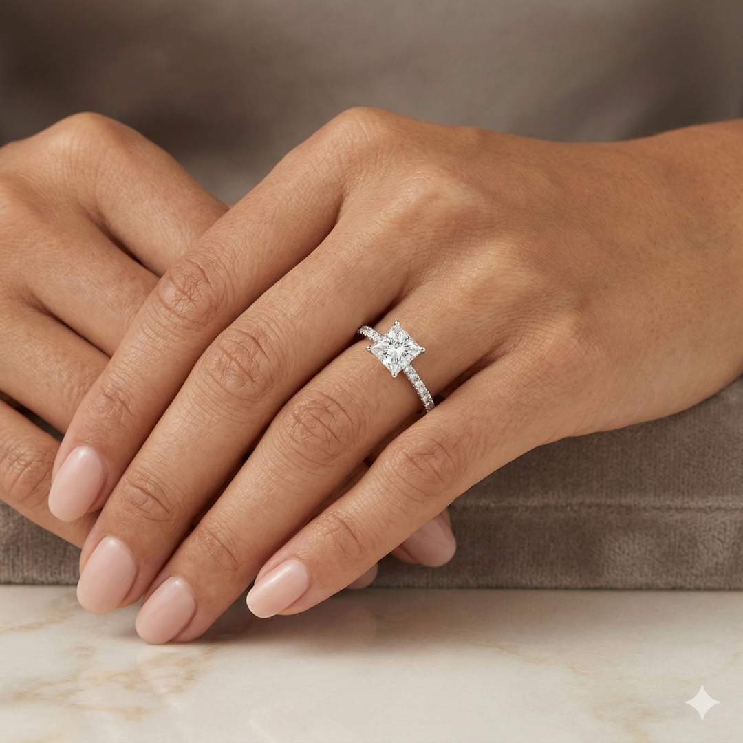 A brand-new, unused, certified natural diamond solitaire engagement ring, this exquisite piece captures the perfect balance of timeless romance and modern brilliance. At its heart is a stunning 1.54-carat princess-cut diamond, graded G in colour and SI3 in clarity, radiating an enchanting sparkle that instantly draws the eye. The centre stone is complemented by a delicate cluster of brilliant-cut diamonds along the shoulders, totalling 0.17 carats, with G–H colour and SI1–SI2 clarity, enhancing the ring’s luminosity and creating a graceful flow of light across the band.