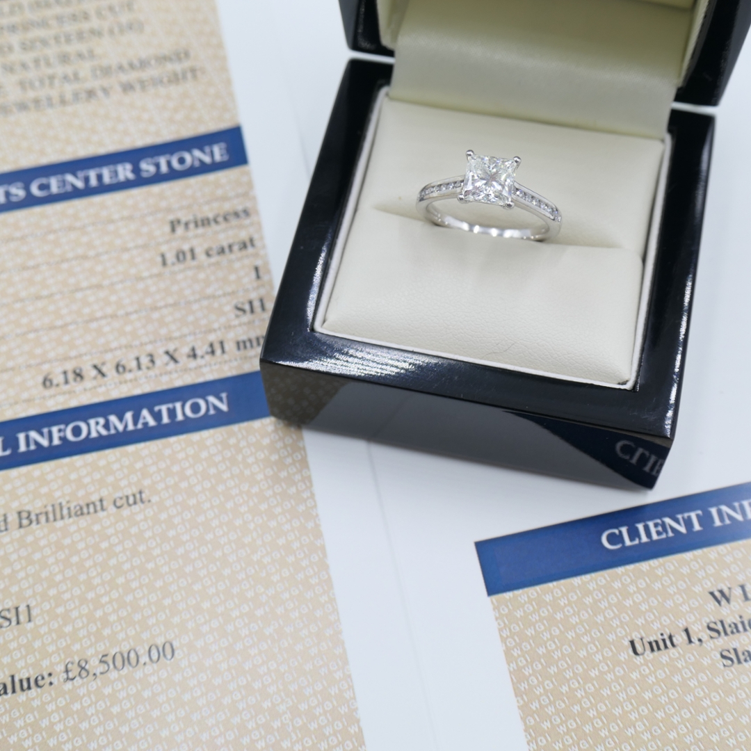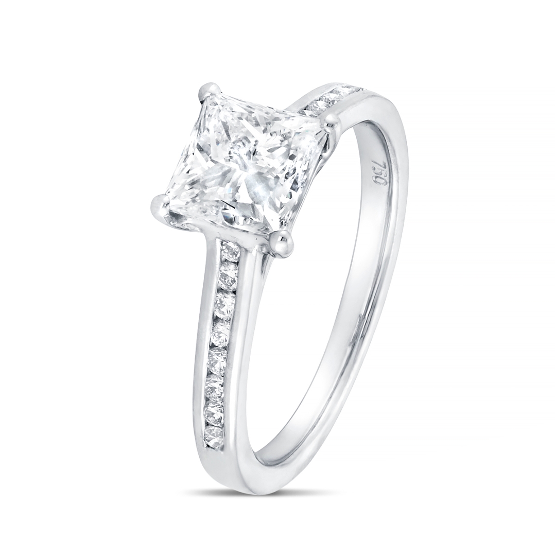 A brand-new, unused 18ct white gold diamond ring showcasing the timeless allure and enduring prestige of natural diamonds. At its heart sits a breathtaking 1.01-carat princess-cut natural diamond, exuding brilliance and fire from every angle. With an I colour grade and SI2 clarity, the central stone radiates the pure, captivating beauty that only a genuine earth-formed diamond can possess.