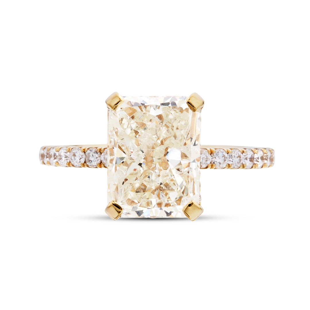 A brand-new, unused certified natural diamond solitaire engagement ring that combines impressive scale, refined sparkle and a beautifully warm presence. At its centre sits a striking 4.04ct radiant-cut fancy light yellow diamond in SI2 clarity, offering a soft golden hue with lively flashes of brilliance that make the stone instantly captivating. The radiant cut enhances both colour and fire, giving the diamond a confident, elongated profile that stands out beautifully when worn. Accentuating the centre stone are natural brilliant-cut diamonds along the shoulders, totalling 0.49ct in G–H colour and SI1–SI2 clarity, adding crisp contrast and enhancing the overall luminosity. These natural diamonds contribute significantly to the ring’s desirability, reflecting the strong and enduring appreciation collectors hold for genuine, earth-formed stones admired for their rarity, authenticity and unmistakable charm.