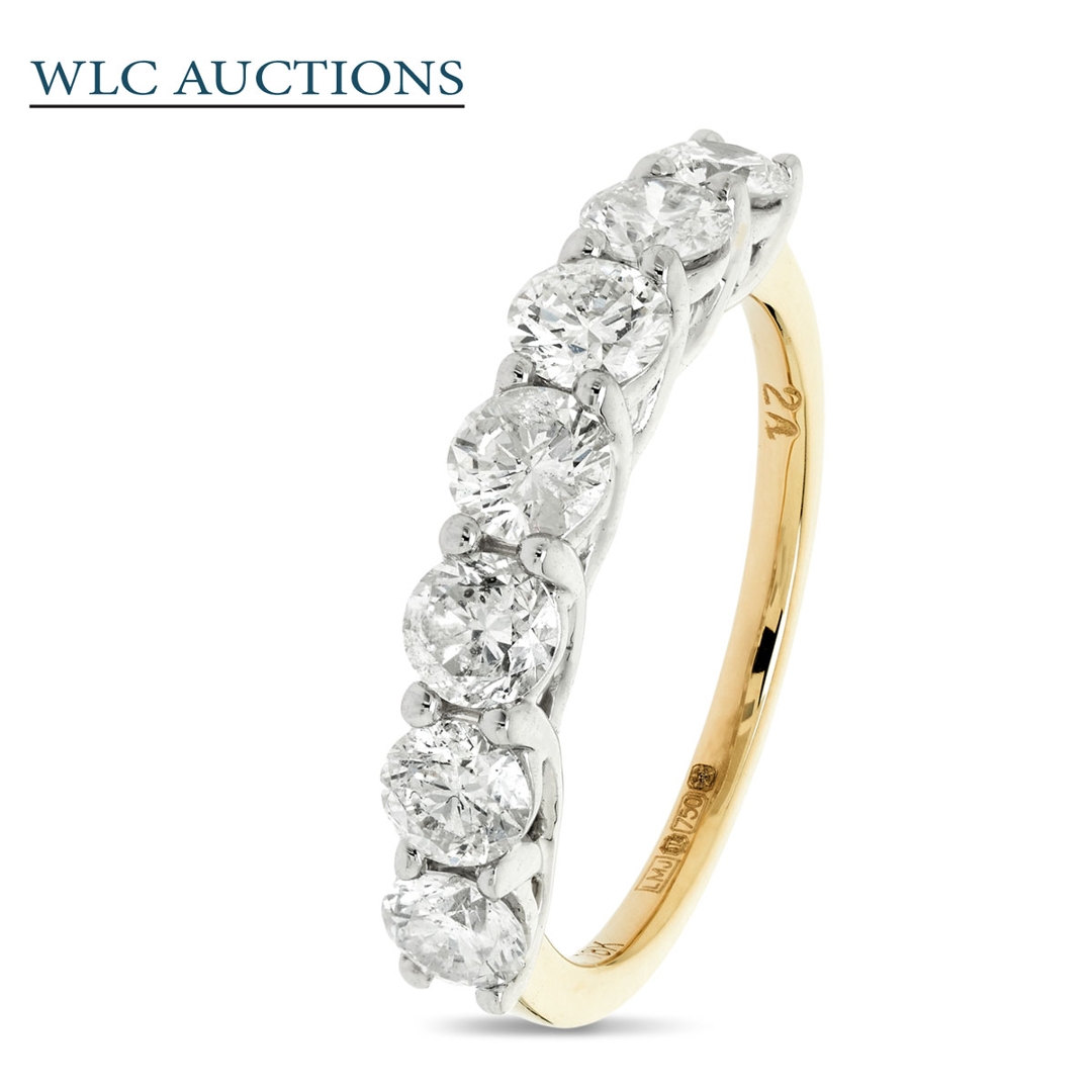 A brand-new, unused, certified natural diamond seven-stone eternity ring, set with seven brilliant-cut diamonds in a refined combination of 18ct yellow and white gold. With a total diamond weight of 1.70 ct, the evenly spaced stones create a continuous, balanced line of brilliance across the finger, offering a strong visual presence while maintaining a timeless, elegant profile. The contrast between the warm yellow gold and bright white settings enhances each diamond, adding depth and definition to the overall design.