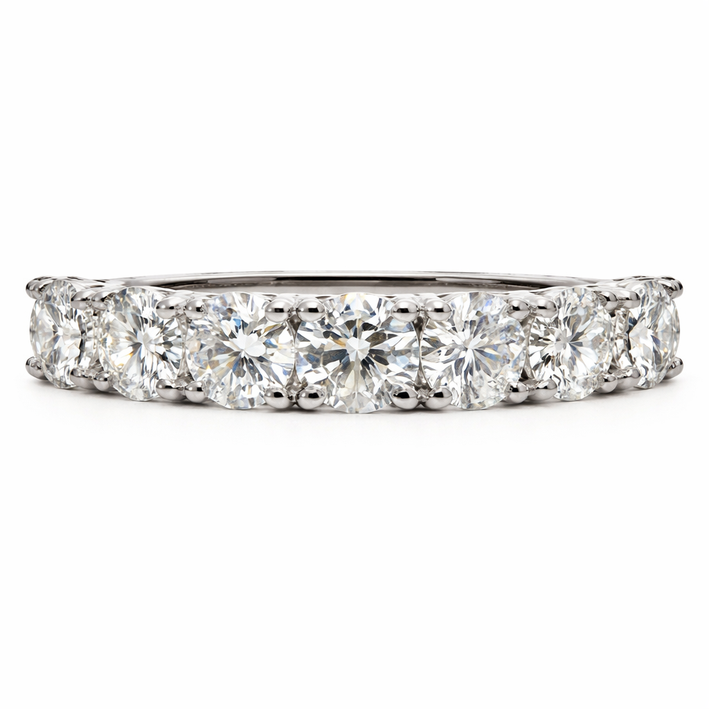 A brand-new, unused, certified natural diamond seven-stone eternity ring, set with seven beautifully matched brilliant-cut diamonds totalling 2.01ct, elegantly mounted in platinum. The seven-stone design offers a fuller, more continuous spread of brilliance across the finger, combining timeless styling with a slightly more substantial presence, while allowing each diamond to contribute equally to the overall display of light.
