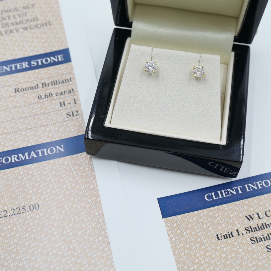 A brand new, unused certified pair of natural diamond solitaire earrings that embody understated luxury and effortless brilliance. Each earring holds a brilliant-cut natural diamond, totalling 0.60ct, carefully selected for its lively sparkle and perfect balance of light and depth. The diamonds, graded H–I in colour and SI2 in clarity, emit a warm, natural glow that blends beautifully with the rich tones of 18ct yellow gold. The craftsmanship is elegant and precise, with each diamond securely set to maximise brilliance and symmetry. Weighing 1.39 grams and professionally valued at £2,225, these earrings are the ideal blend of refinement, comfort and timeless appeal.