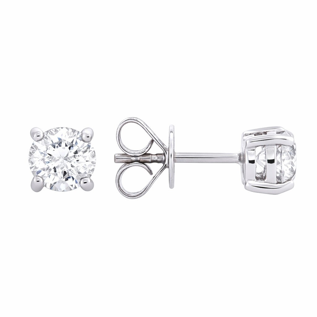 A brand new, unused certified pair of natural diamond solitaire earrings that epitomise timeless beauty, sophistication and brilliance. Each earring is set with a magnificent, brilliant-cut natural diamond, totalling an impressive 1.04 ct. The diamonds are graded G–H in colour and SI1–SI2 in clarity, displaying exceptional sparkle, fire and balance — a true testament to expert selection and craftsmanship. The diamonds are securely mounted in 18ct white gold, whose sleek and luminous finish perfectly complements their radiant brilliance. With a total weight of 1.93 grams, these earrings offer an ideal combination of elegance, comfort and enduring quality, making them a refined statement of luxury and prestige.