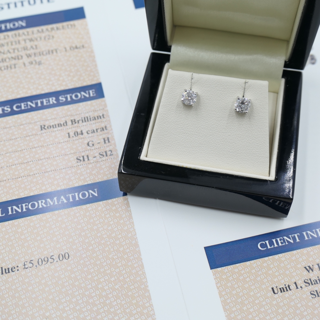 A brand new, unused certified pair of natural diamond solitaire earrings that epitomise timeless beauty, sophistication and brilliance. Each earring is set with a magnificent, brilliant-cut natural diamond, totalling an impressive 1.04 ct in combined weight. The diamonds are graded G–H in colour and SI1–SI2 in clarity, displaying exceptional sparkle, fire and balance — a true testament to expert selection and craftsmanship. The diamonds are securely mounted in 18ct white gold, whose sleek and luminous finish perfectly complements their radiant brilliance. With a total weight of 1.93 grams, these earrings offer an ideal combination of elegance, comfort and enduring quality, making them a refined statement of luxury and prestige.