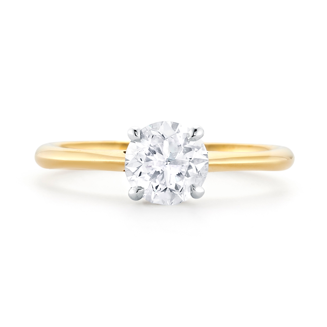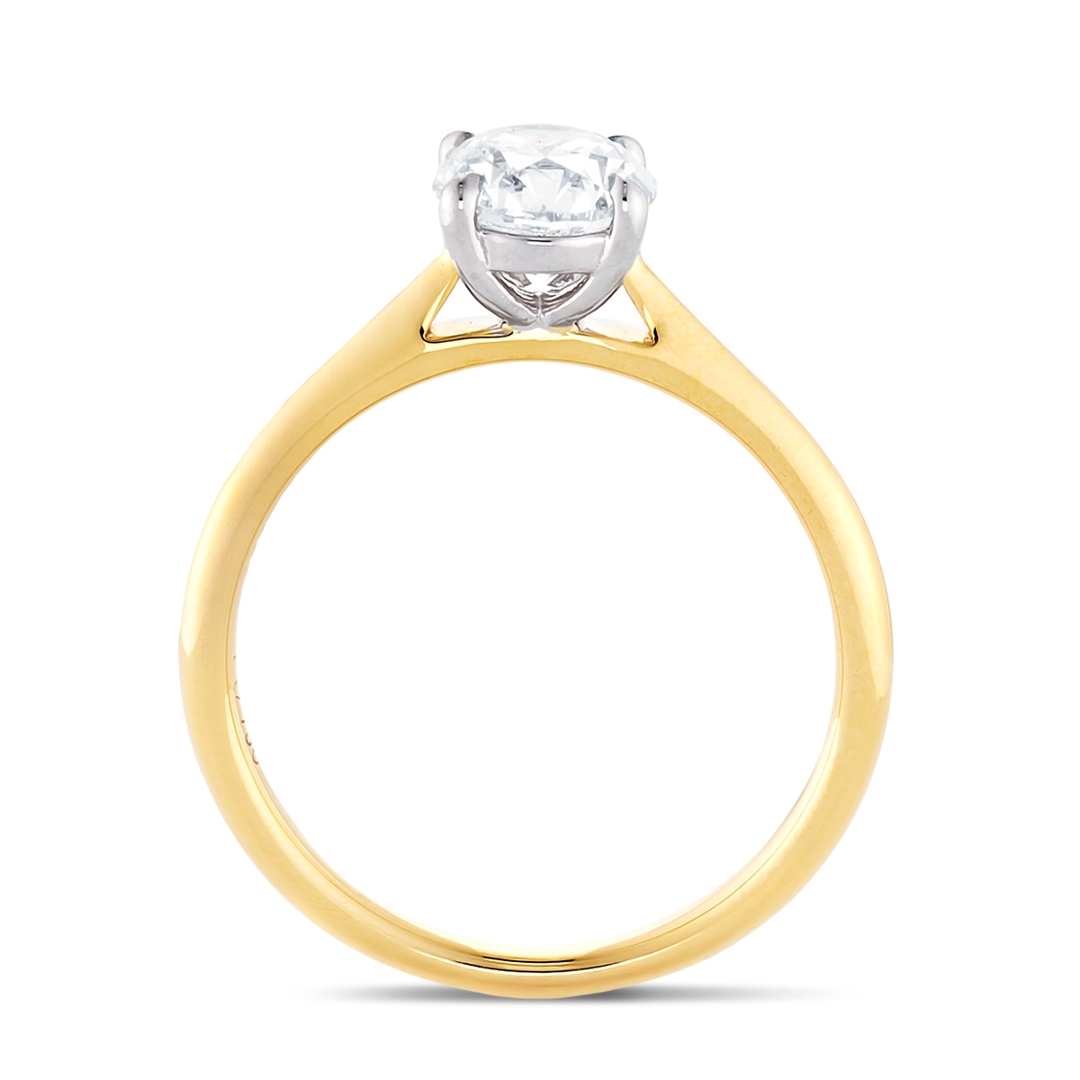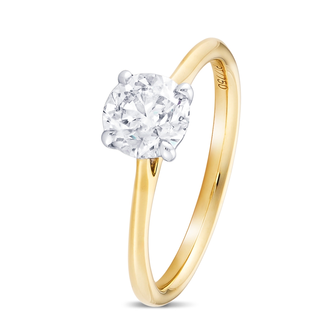 A brand-new, unused, certified natural diamond solitaire engagement ring, set with one brilliant cut diamond at the centre, set in platinum & 18ct yellow gold.