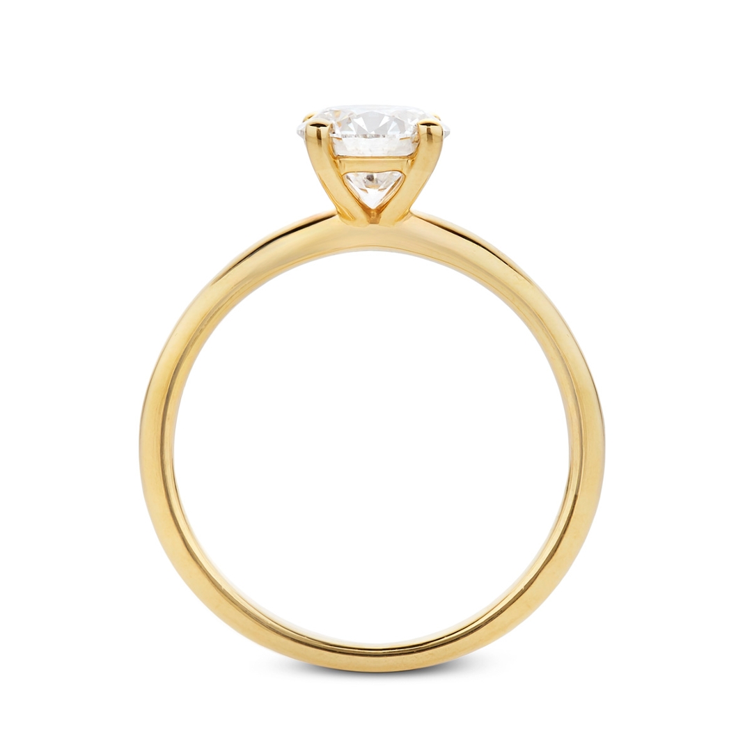 A brand-new, unused certified natural diamond solitaire engagement ring, featuring a single brilliant-cut diamond at its centre, set in 18ct yellow gold. This classic design is celebrated for its simplicity and elegance, allowing the diamond to remain the clear focal point, while the warm tone of the yellow gold band enhances its natural brilliance and creates a timeless, balanced aesthetic suited to both modern and traditional tastes.