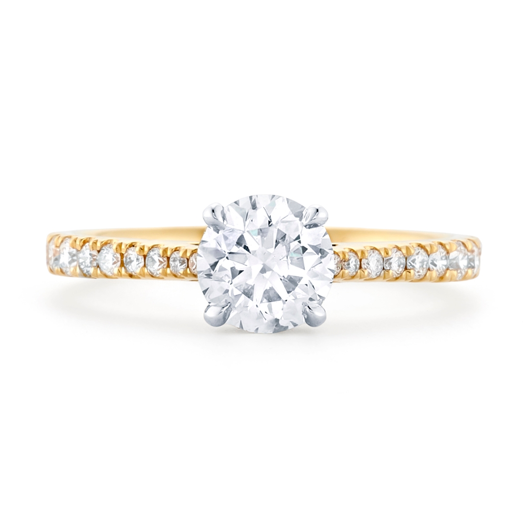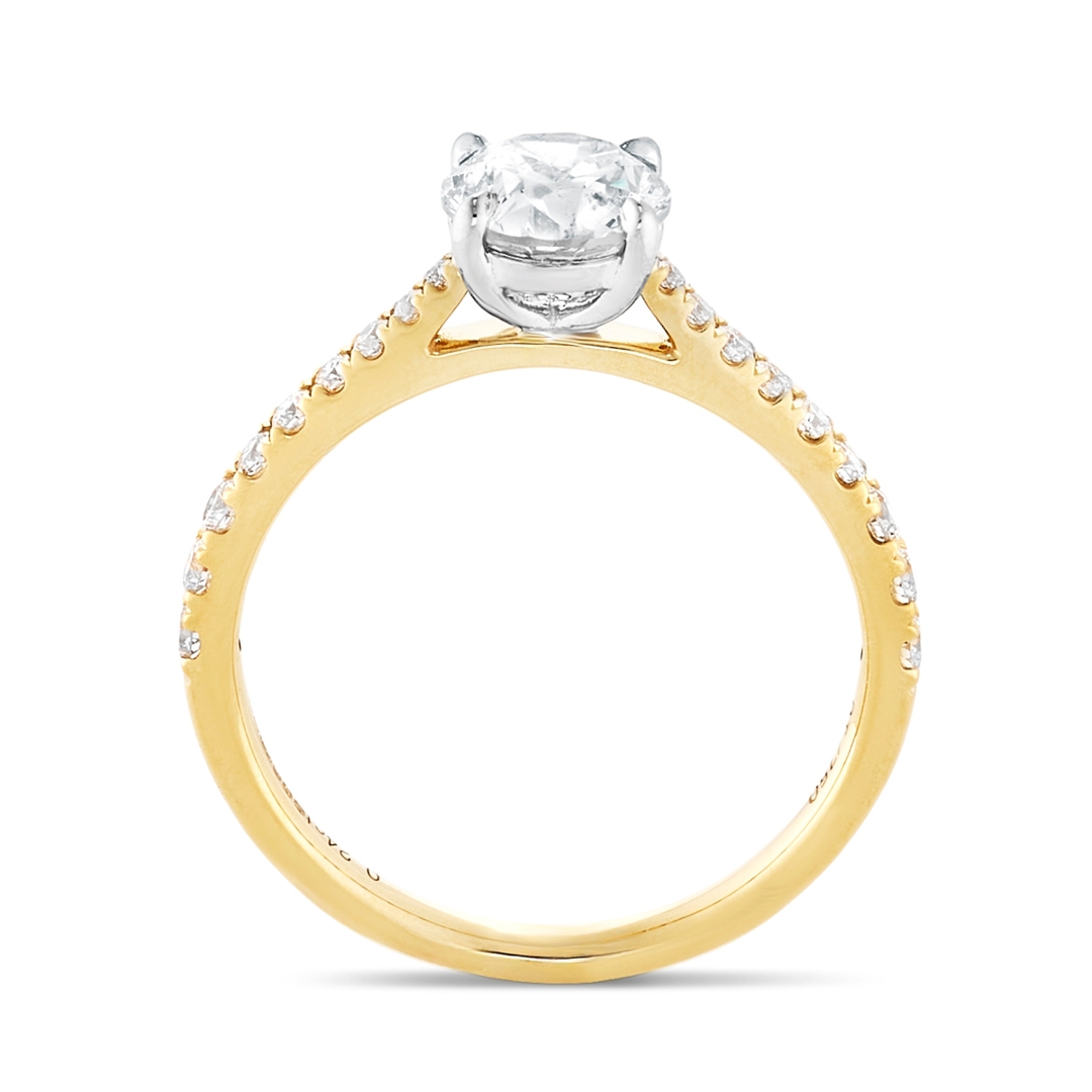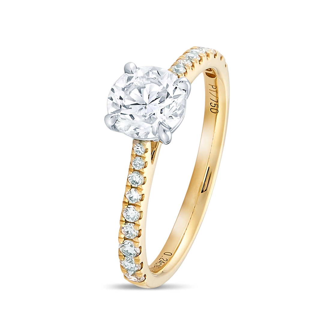 A brand-new, unused certified platinum and 18ct yellow gold solitaire engagement ring, created to highlight the timeless beauty of natural diamonds. At the centre rests a brilliant-cut diamond weighing 1.00 carats, graded SI1 clarity and I colour, offering a fine balance of sparkle and size. Enhancing this focal point, a cluster of brilliant-cut diamonds adorns the shoulders, with a combined weight of 0.24 carats, graded between VS2 and SI1 clarity and G–H colour. This thoughtful arrangement brings extra brilliance to the design, giving the ring an elegant presence and ensuring it catches the eye from every angle.