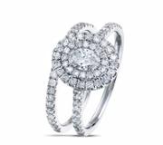 A brand-new, unused, certified natural diamond solitaire engagement ring, set with one radiant-cut diamond at the centre & numerous brilliant-cut diamonds in a double-halo setting & a cluster of brilliant-cut diamonds on the shoulders, set in platinum.