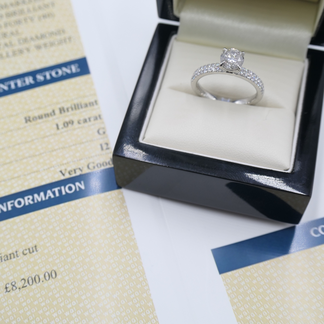 A brand new, unused, certified platinum natural diamond solitaire ring is a testament to timeless beauty and sophistication. At its heart shines a magnificent, brilliant-cut diamond boasting a substantial weight of 1.09 carats. This exquisite diamond captures the light with unparalleled brilliance and radiance, making it the centrepiece of the ring.