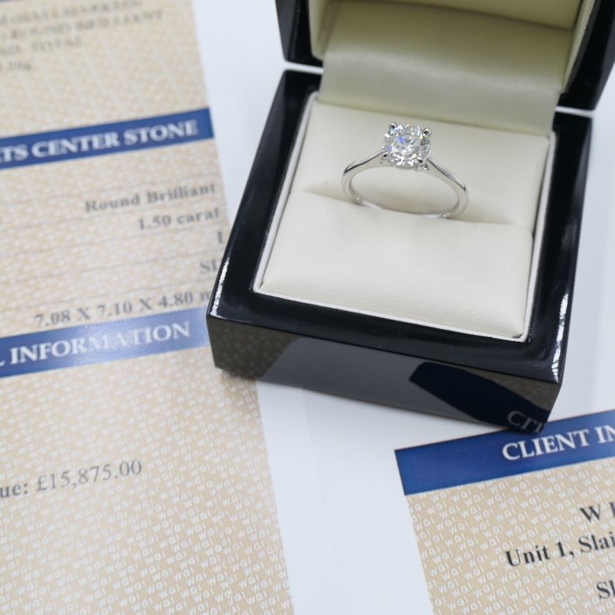A brand-new, unused, certified platinum natural diamond solitaire engagement ring that celebrates the beauty and rarity of natural diamonds. At the centre sits a 1.50ct brilliant cut diamond, chosen for its fire, sparkle, and timeless elegance. With SI2 clarity and an I colour grade, the diamond reveals warm, captivating brilliance, with each facet catching the light to create a play of radiance that is both enchanting and distinctive. As a natural stone, its authenticity adds rarity and lasting significance.