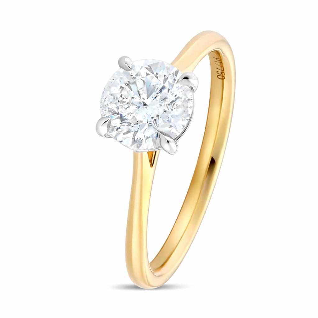 A brand-new, unused, certified natural diamond solitaire engagement ring, set with one brilliant cut diamond at the centre, set in platinum & 18ct yellow gold.