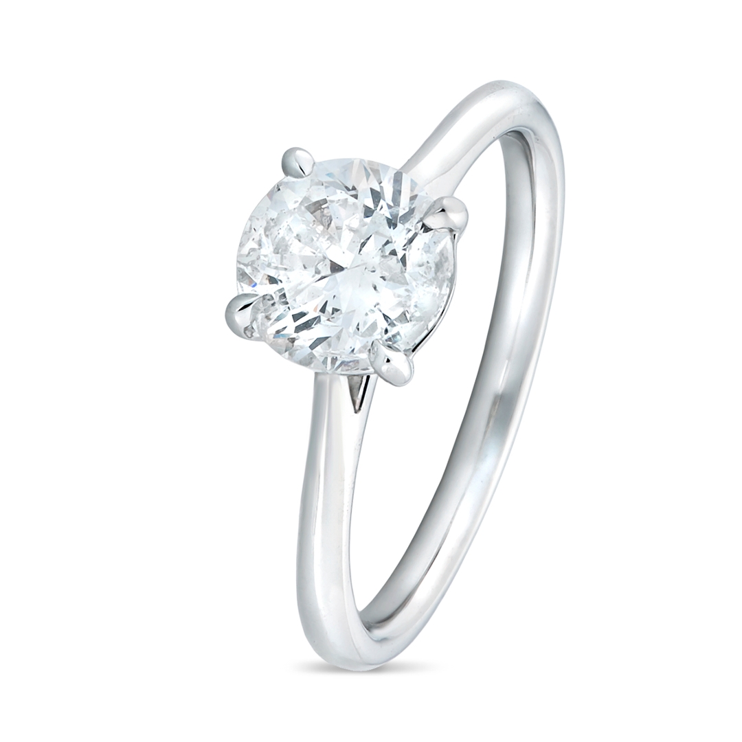 A brand-new, unused, certified natural diamond solitaire engagement ring, set with one brilliant cut diamond at the centre, set in platinum.