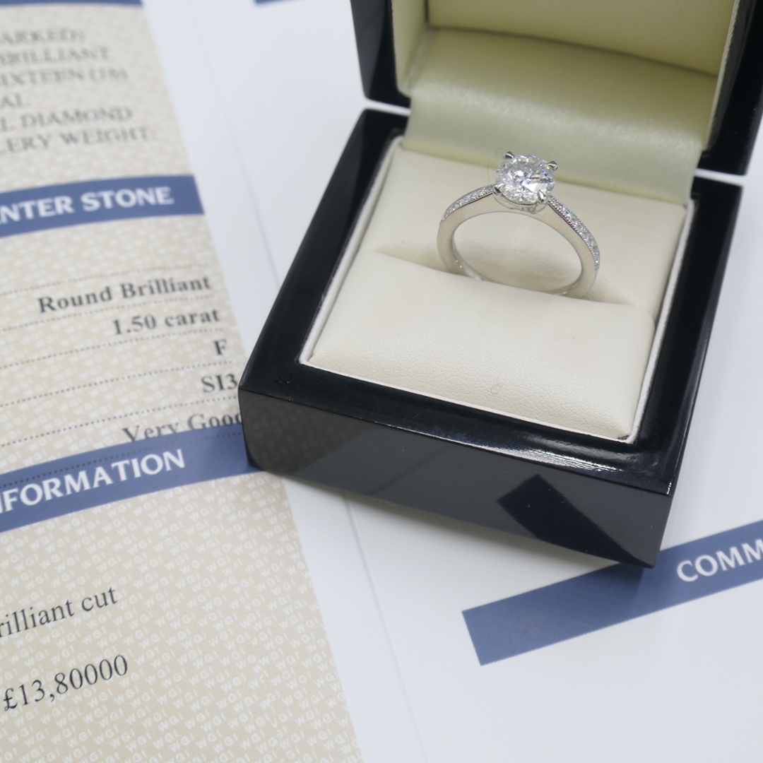 A brand new, unused, certified platinum natural diamond solitaire ring meticulously crafted to captivate hearts and inspire admiration. At its core, a dazzling, brilliant-cut diamond shines, weighing 1.50 carats. With a clarity rating of SI3 and a colour grade of F, this central diamond exudes unparalleled brilliance and purity, symbolising the depth of your affection. Accentuating the allure of the central diamond, brilliant-cut diamonds grace the shoulders of the ring, totalling 0.12 carats and 6.26 grams in weight. With a clarity ranging from VS to SI and a colour grade of F-G, these shoulder diamonds add an extra layer of sparkle and sophistication, enhancing the ring's overall charm and elegance.