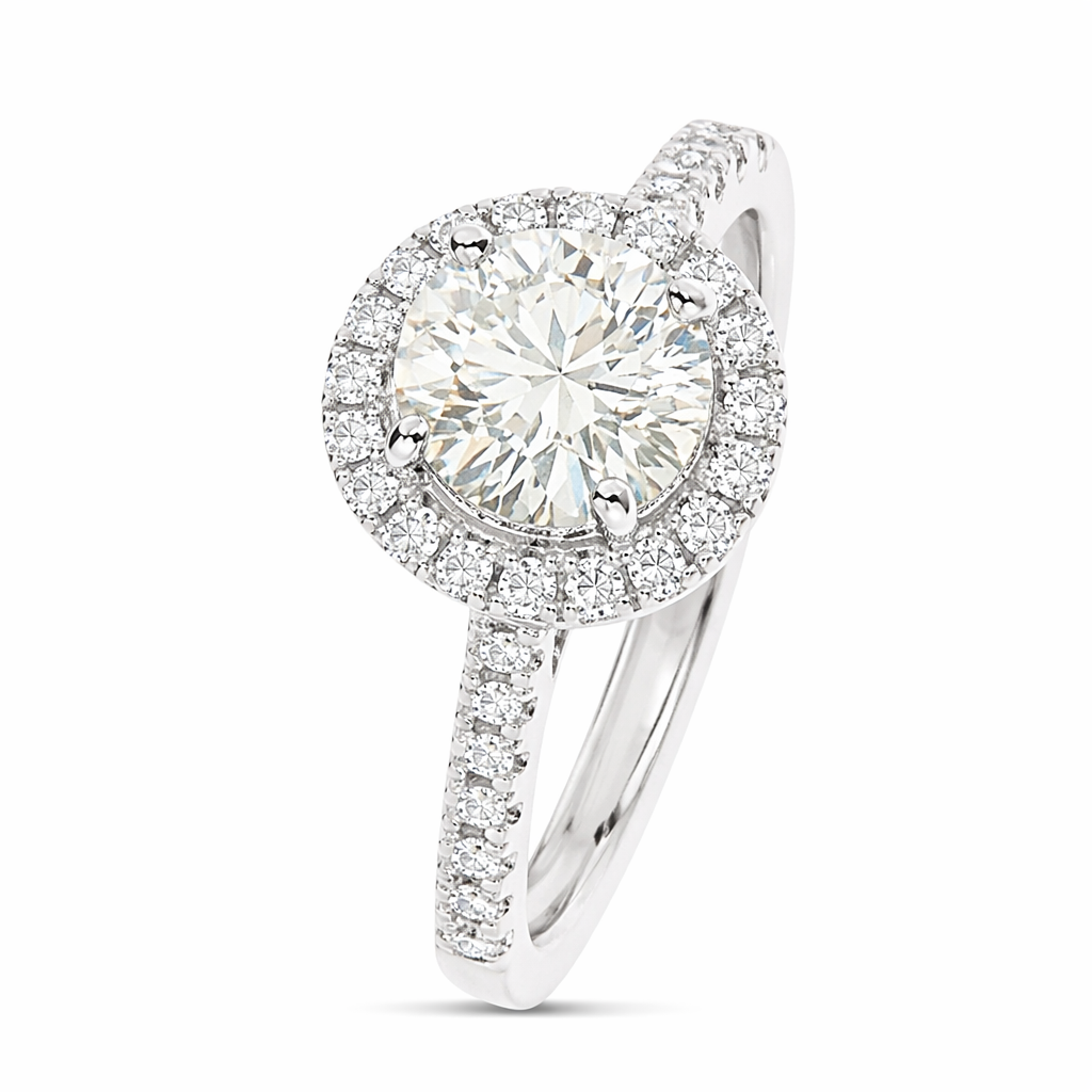 A brand new, unused, certified 18ct white gold natural diamond solitaire ring, a stunning masterpiece that epitomises timeless elegance and sophistication. This exquisite ring features a brilliant-cut diamond weighing 1.56 carats at its centre, surrounded by a halo setting of 28 brilliant-cut diamonds, further accentuated by additional diamonds adorning the shoulders.