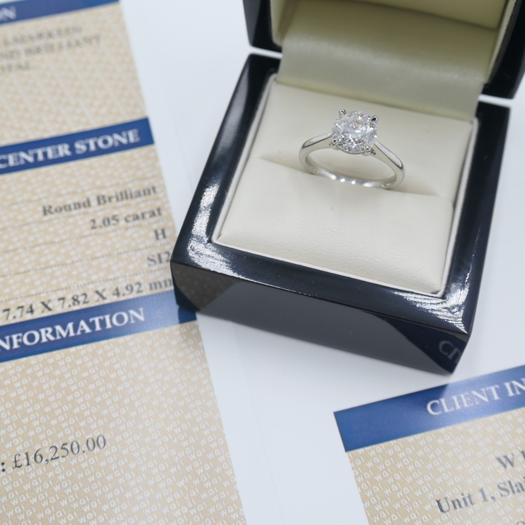 A brand-new, unused certified platinum solitaire engagement ring, created to showcase the brilliance and rarity of natural diamonds. At its centre sits a striking 2.05-carat brilliant-cut diamond, graded SI2 clarity and H colour, which delivers a strong presence with a lively sparkle that captures the light from every angle. The clean, elegant platinum setting provides both durability and refinement, ensuring the diamond is celebrated as the focal point of this timeless design.