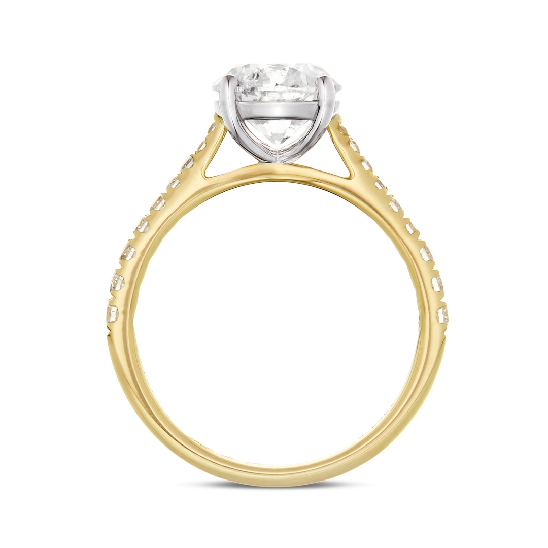 The shoulders are set with a cluster of brilliant-cut diamonds totalling 0.25ct, with SI1 clarity and G–H colour grades. These accent stones introduce additional sparkle and light dispersion, enhancing the centre diamond without detracting from its prominence. The contrast between platinum and yellow gold adds a classic yet distinctive character, appealing to those seeking both tradition and individuality in their jewellery.