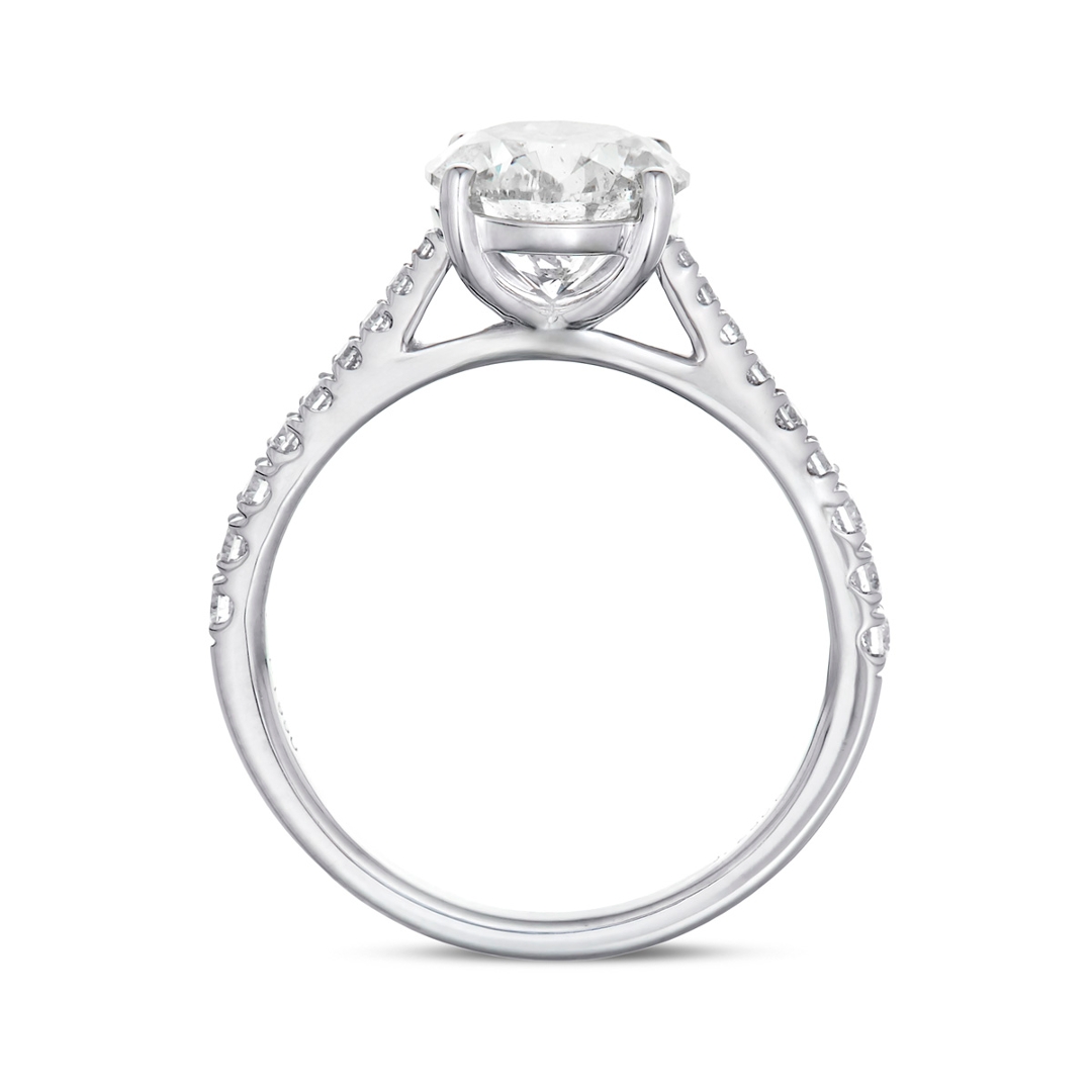 The shoulders are set with a cluster of brilliant-cut diamonds totalling 0.25ct, with SI1 clarity and G–H colour grades. These accent stones provide a seamless extension of sparkle, enhancing overall light performance while maintaining a balanced, sophisticated profile that naturally emphasises the centre diamond.