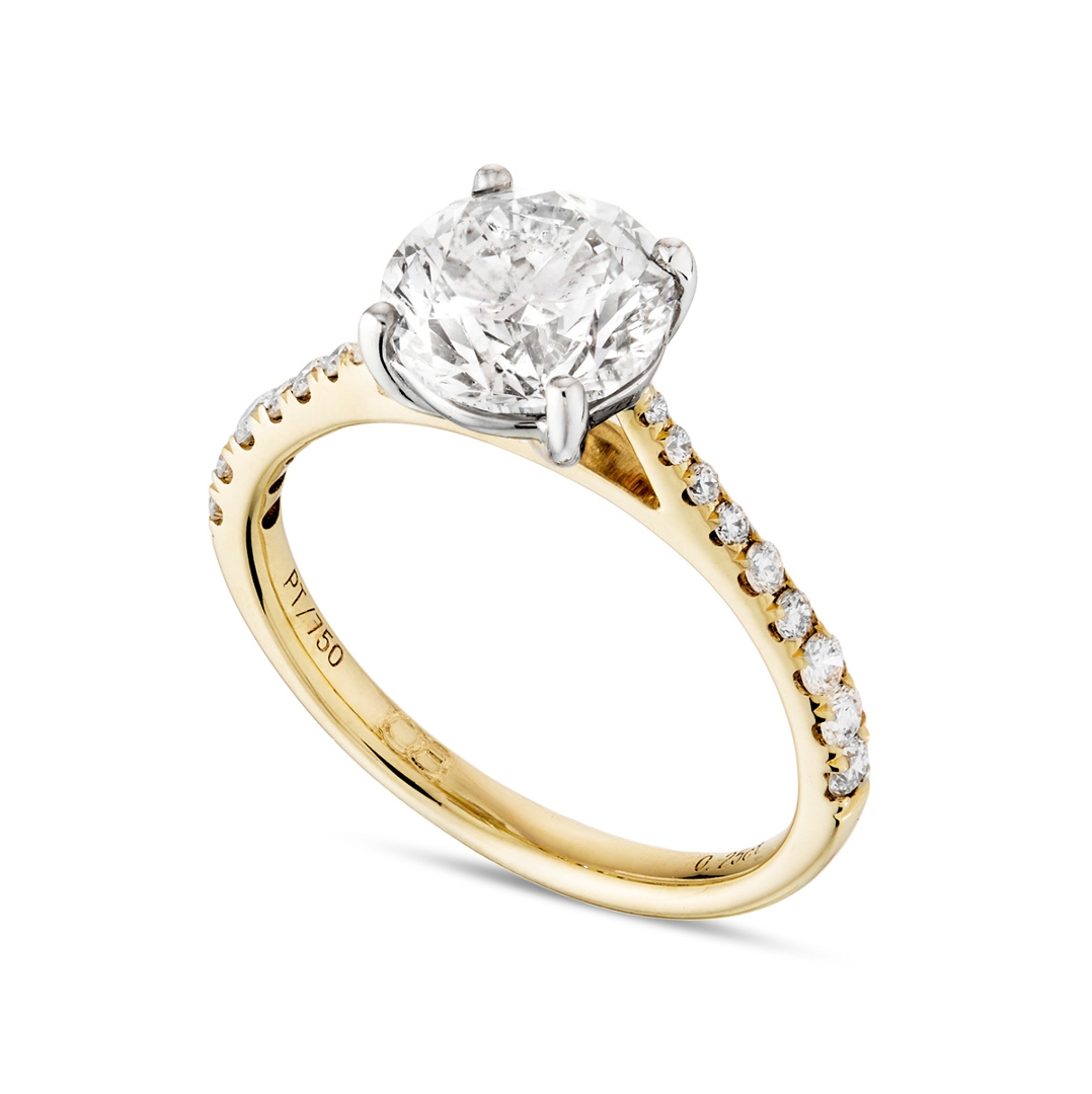 A brand-new, unused certified natural diamond solitaire engagement ring, crafted in a distinguished combination of platinum and 18ct yellow gold, centred with a substantial 2.08ct brilliant-cut diamond. Graded H colour and SI2 clarity, the centre stone displays a soft warmth complemented by lively brilliance, offering impressive scale and a confident presence within a timeless and elegant setting.