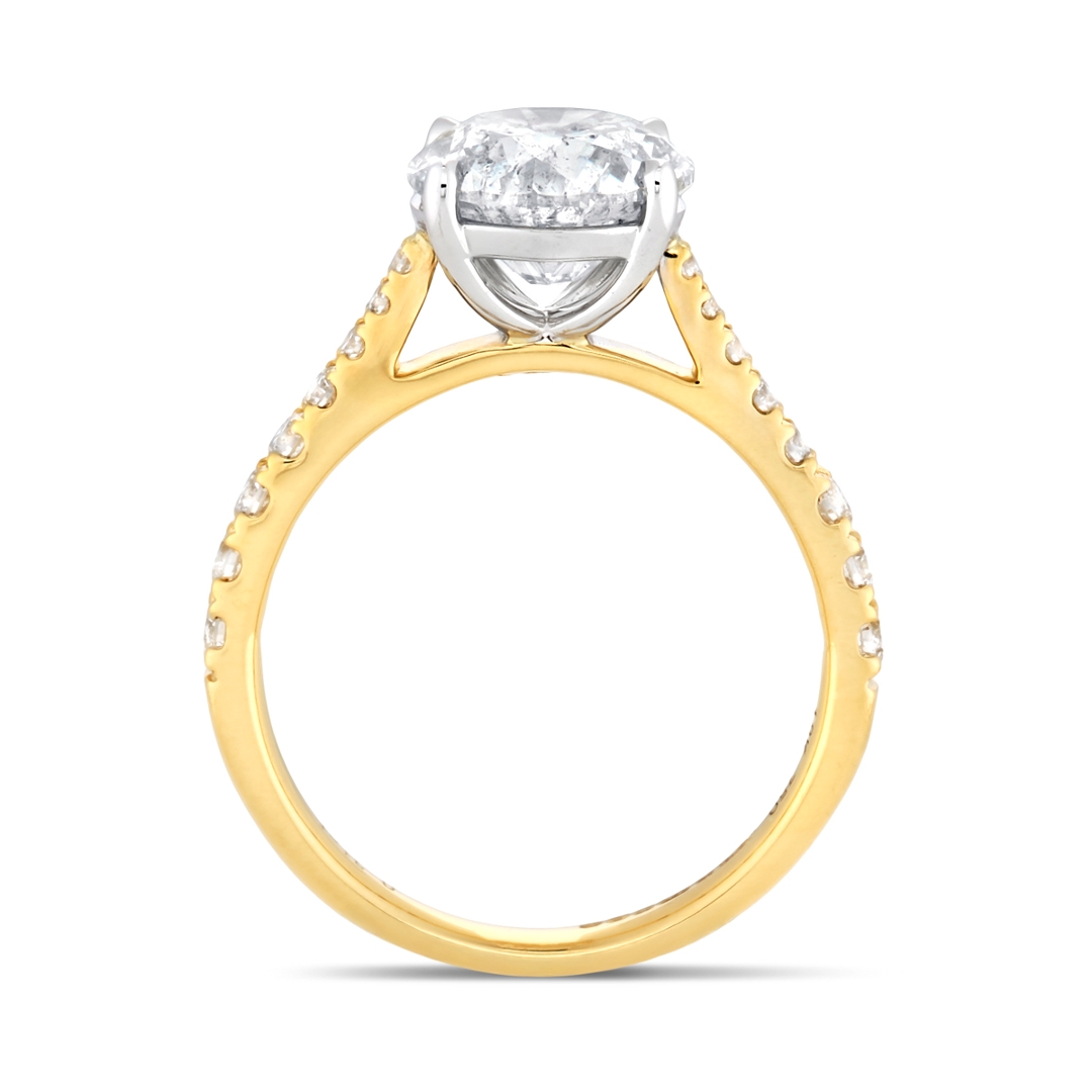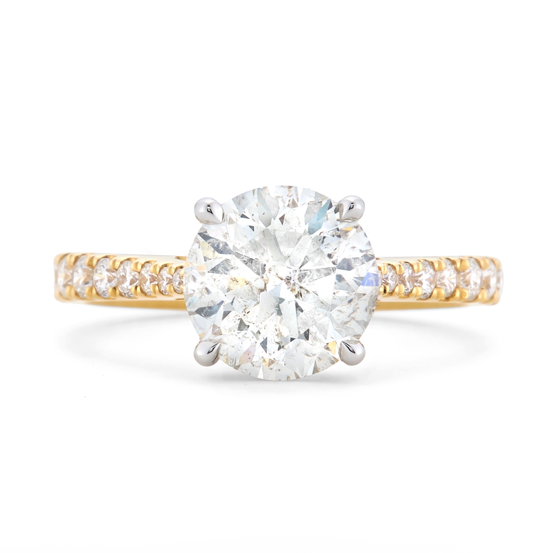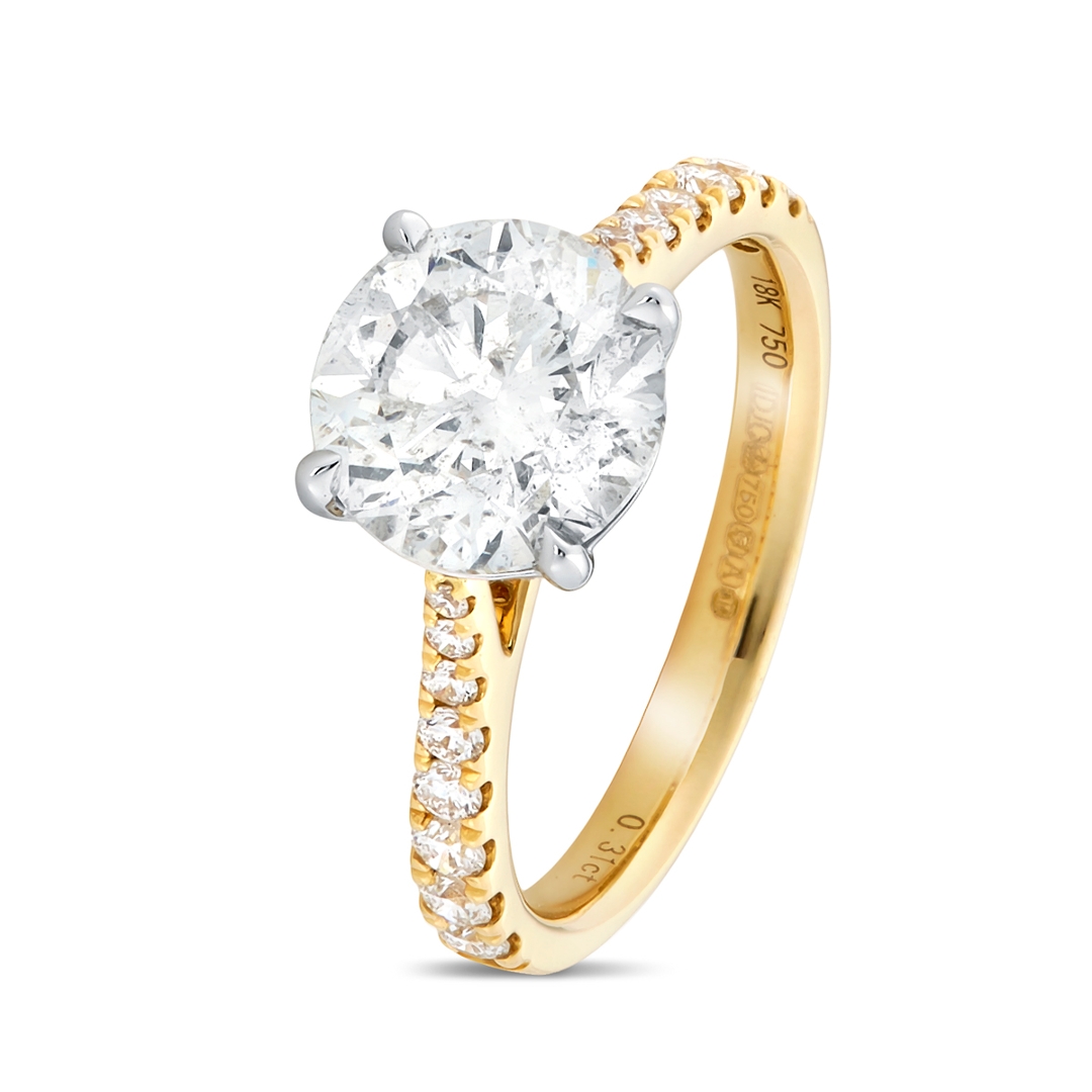 A brand-new, unused certified 18ct yellow and white gold solitaire engagement ring, designed to showcase the exceptional beauty of natural diamonds. At its centre rests a brilliant cut diamond weighing 2.52 carats, graded SI2 clarity and G colour, offering an impressive sparkle and a striking presence that immediately draws the eye. Enhancing the centre stone, the shoulders are adorned with a cluster of additional brilliant-cut diamonds, totalling 0.31 carats, graded SI1 clarity and F–G colour, which adds further brilliance and balance to the design. The combination of white and yellow gold provides both contrast and warmth, giving the ring a distinctive yet timeless character.