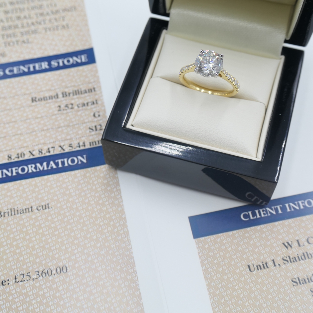 A brand-new, unused certified natural diamond engagement ring that captures the true brilliance and rarity of nature’s finest creation. At its centre lies a mesmerising 2.52-carat brilliant-cut diamond, graded G for colour and SI2 for clarity, radiating a stunning play of light that reflects its pure, natural beauty. Unlike synthetic alternatives, this genuine diamond holds a charm that only nature can produce — a timeless reminder of authenticity, craftsmanship and enduring elegance.