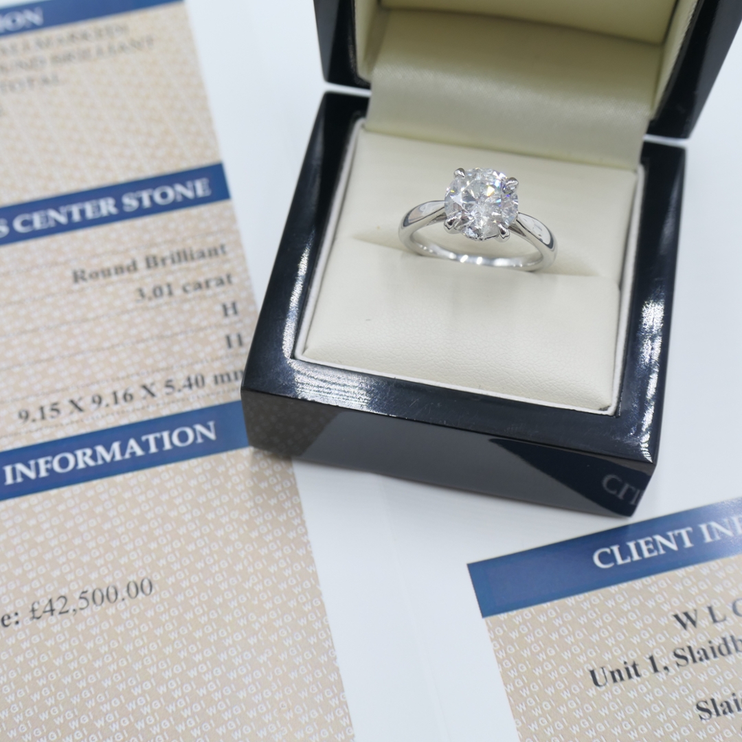 A brand new, unused, certified platinum natural diamond solitaire ring, a dazzling testament to refined luxury and sophistication. Set with a breathtaking 3.01-carat brilliant cut diamond at its centre, this ring radiates brilliance and beauty, capturing the essence of enduring love and commitment.