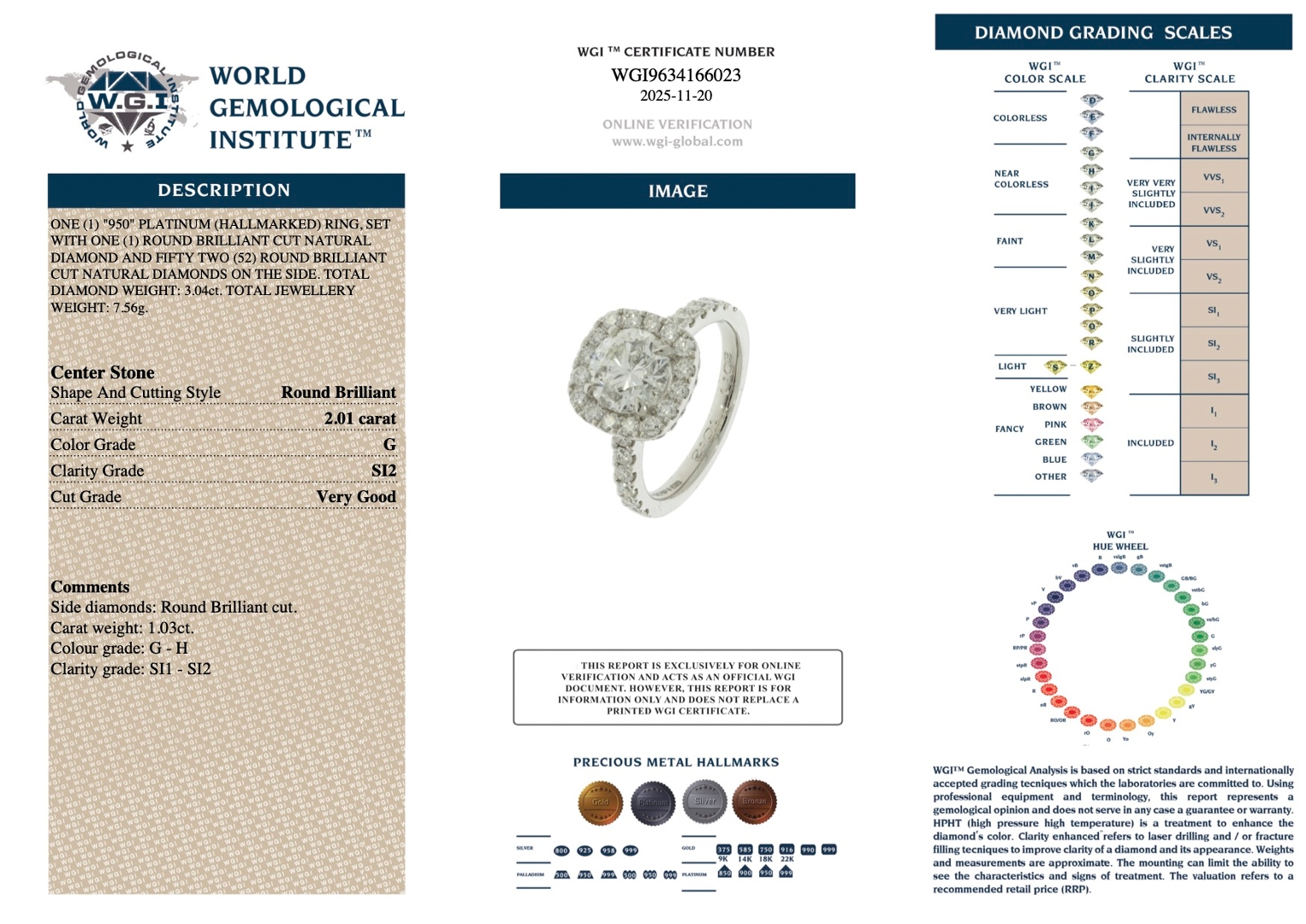 Encircling the centre diamond is a halo of brilliant-cut natural diamonds, extending seamlessly along the shoulders and adding a further 1.03ct in total. These accent stones, graded G–H colour and SI1–SI2 clarity, are carefully matched to enhance the centre stone’s presence, amplifying sparkle and creating exceptional finger coverage. The platinum setting provides a cool-toned backdrop that enhances the diamonds' brightness while offering strength and durability. The total ring weight is 7.56g, giving a reassuring and substantial feel.