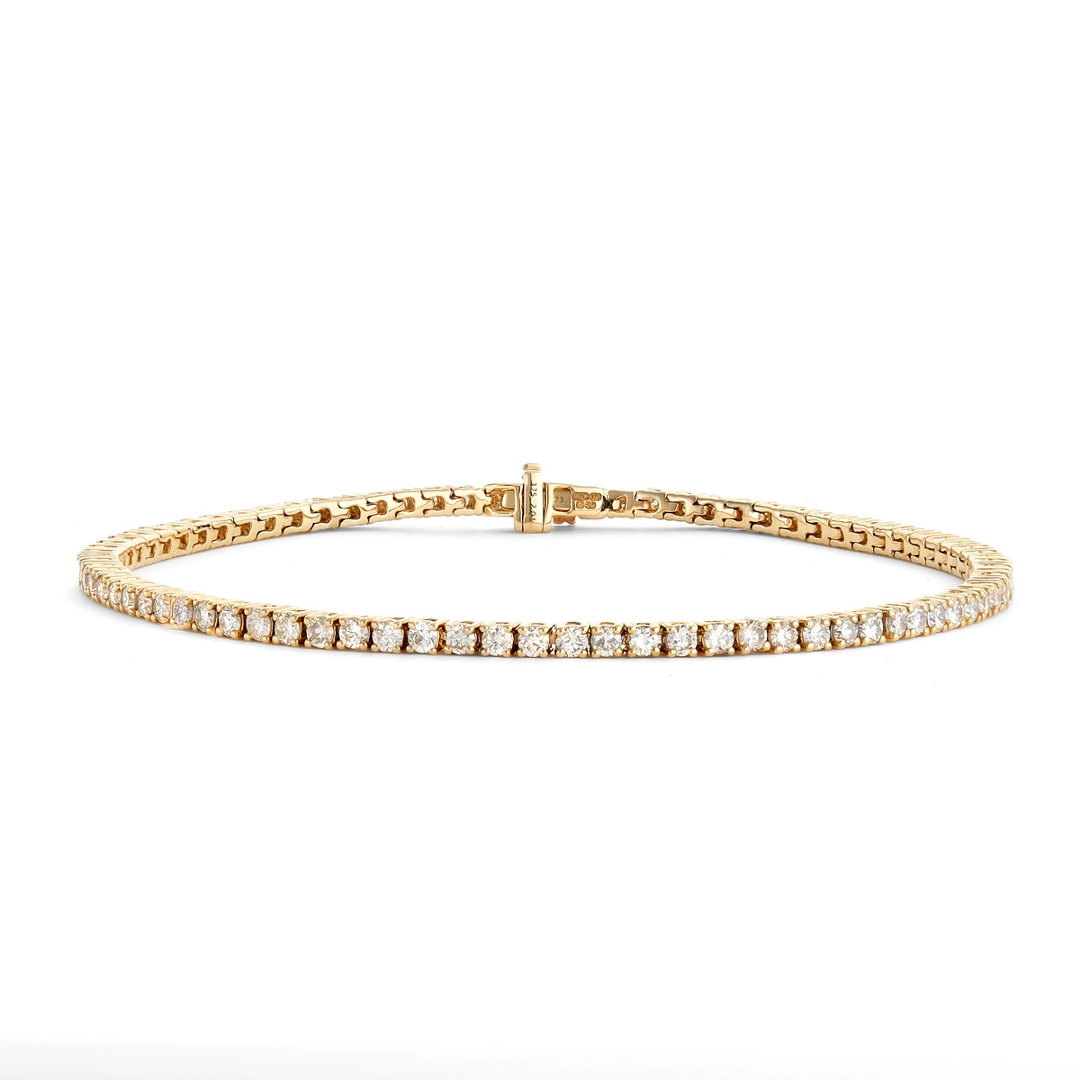 A brand-new, unused, certified natural diamond tennis bracelet, crafted in 9ct yellow gold and presented in pristine condition. The bracelet is set with a continuous cluster of brilliant-cut natural diamonds, totalling 2.02 carats, graded G–H in colour and SI1 clarity. The diamonds are carefully matched to create an even, uninterrupted line of sparkle, while the warm tone of yellow gold adds classic contrast and visual depth. With a total weight of 5.73 grams, the bracelet offers a reassuring feel on the wrist while maintaining a refined and timeless profile suitable for both everyday wear and formal occasions.