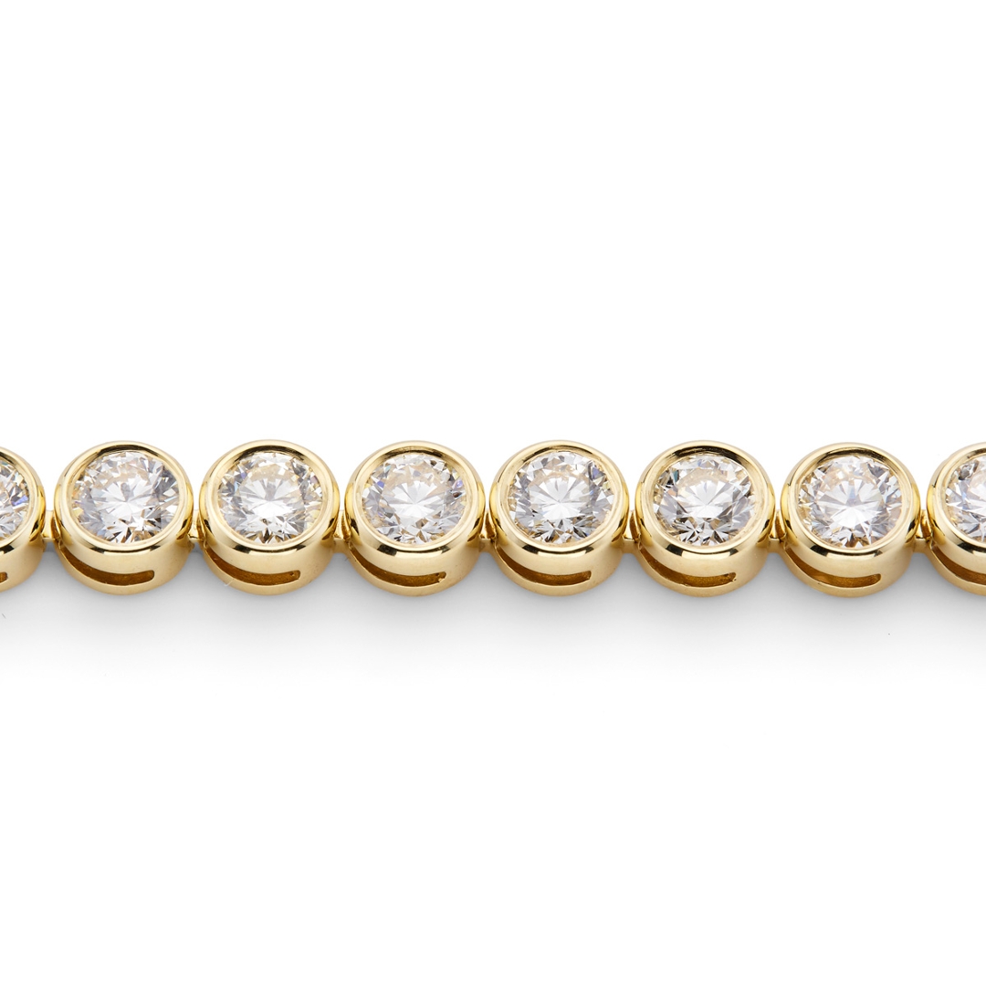 A brand-new, unused certified natural diamond tennis bracelet that showcases timeless sophistication and exceptional craftsmanship. This stunning piece is adorned with a continuous line of brilliant-cut natural diamonds, totalling an impressive 8.01ct. Each diamond has been meticulously matched for symmetry, brilliance and fire, graded F–G in colour and VS1–VS2 in clarity, ensuring a captivating sparkle throughout. Expertly set in 18ct yellow gold, the bracelet’s warm golden hue perfectly complements the radiant white brilliance of the diamonds, creating a refined contrast that enhances its luxurious appeal. Measuring 18cm in length and weighing 19.18 grams, this bracelet combines comfort, elegance and durability. With a professional valuation of £39,660, it stands as a true statement of prestige and refinement.