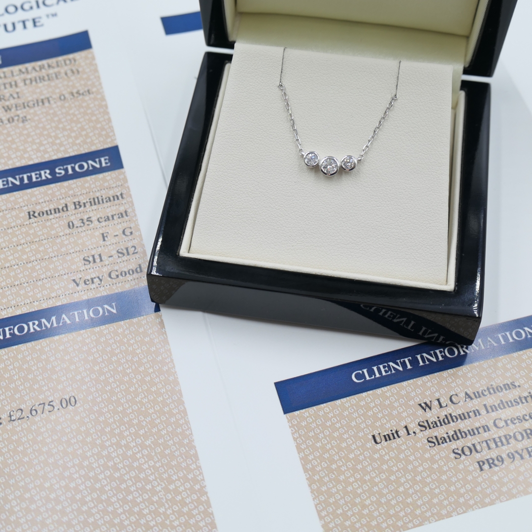 A brand-new, unused 18ct white gold diamond pendant showcasing timeless sophistication and modern refinement. This elegant three-stone cluster design features three round brilliant-cut natural diamonds, totalling 0.35 carats, each carefully selected for its radiant sparkle and precision-cut symmetry. Graded F–G in colour and SI1–SI2 in clarity, the diamonds exude a bright, near-colourless brilliance that perfectly complements the sleek sheen of the white gold setting. The trio arrangement symbolises the past, present, and future, making it a meaningful and versatile piece that pairs effortlessly with any look.