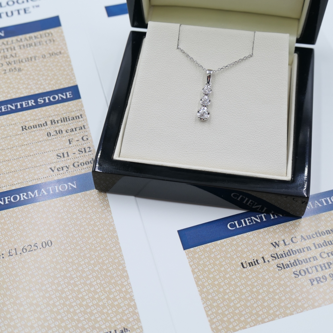 A brand-new, unused certified 18ct white gold natural diamond three-stone droplet pendant, beautifully set with three round brilliant-cut natural diamonds totalling 0.30 carats. Each diamond has been carefully selected for its F–G colour and SI1–SI2 clarity, offering exceptional sparkle and radiance. The vertical design symbolises past, present, and future, creating an elegant flow of light with every movement. Crafted in luminous white gold, the pendant strikes the perfect balance between sophistication and subtle glamour — an effortlessly timeless piece that suits every occasion.