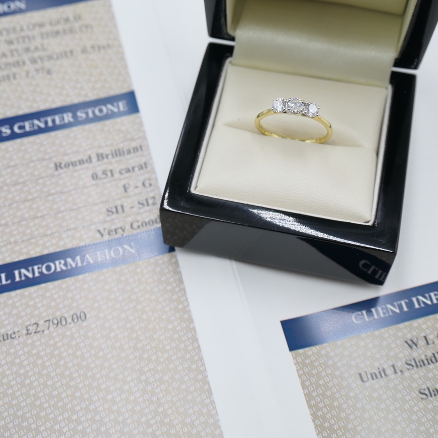 A brand new, unused, certified 18ct white and yellow gold natural diamond three-stone eternity ring is a stunning representation of elegance and sophistication. This exquisite ring features three brilliant-cut diamonds, totalling 0.51 carats in weight. Each diamond is selected for its exceptional sparkle and fire, set in a design that blends the classic appeal of yellow gold with the contemporary beauty of white gold.