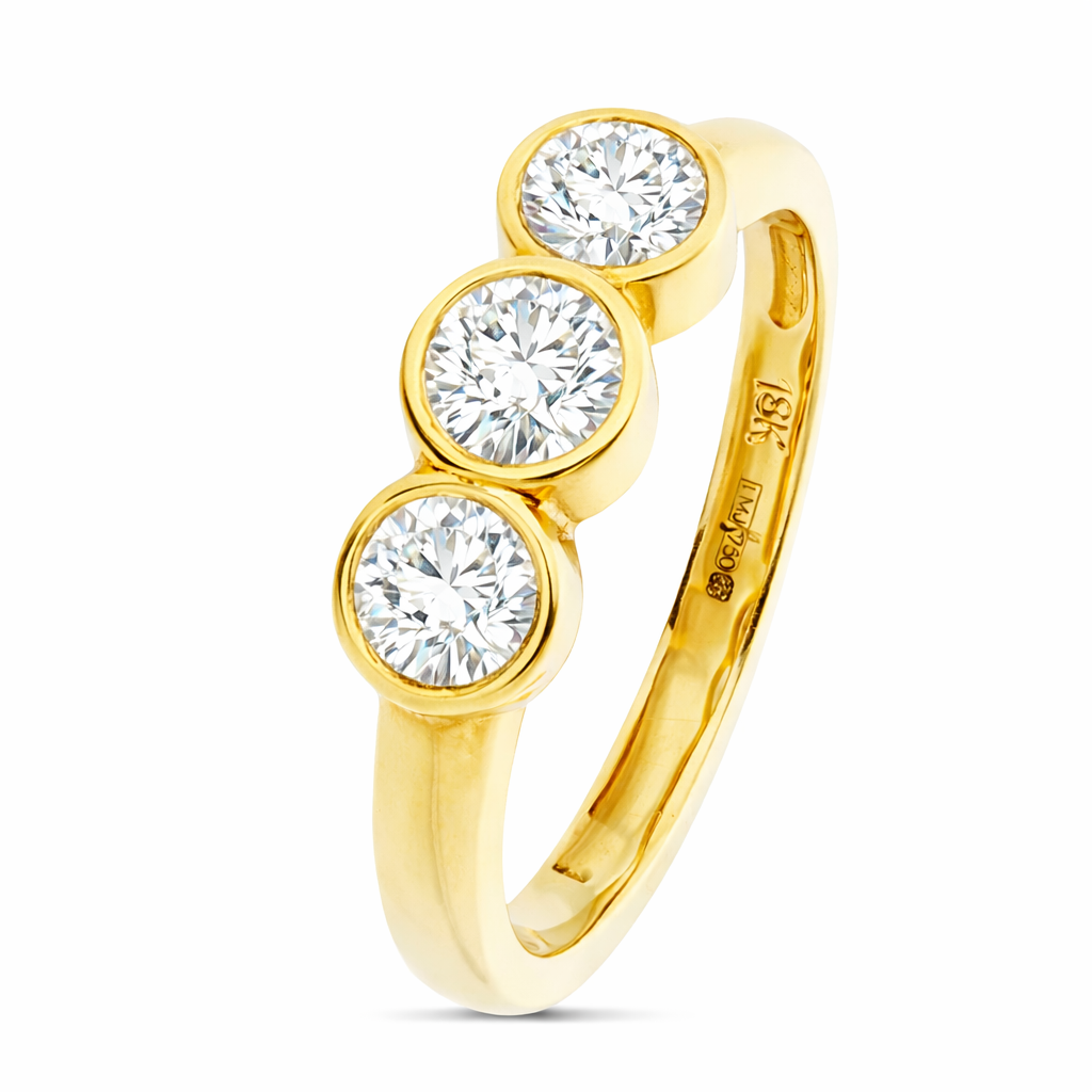 A brand new, unused, certified 18ct yellow gold natural diamond three-stone eternity ring. Crafted to perfection, this ring not only exudes sophistication but also holds immense appreciation potential for its natural diamonds.