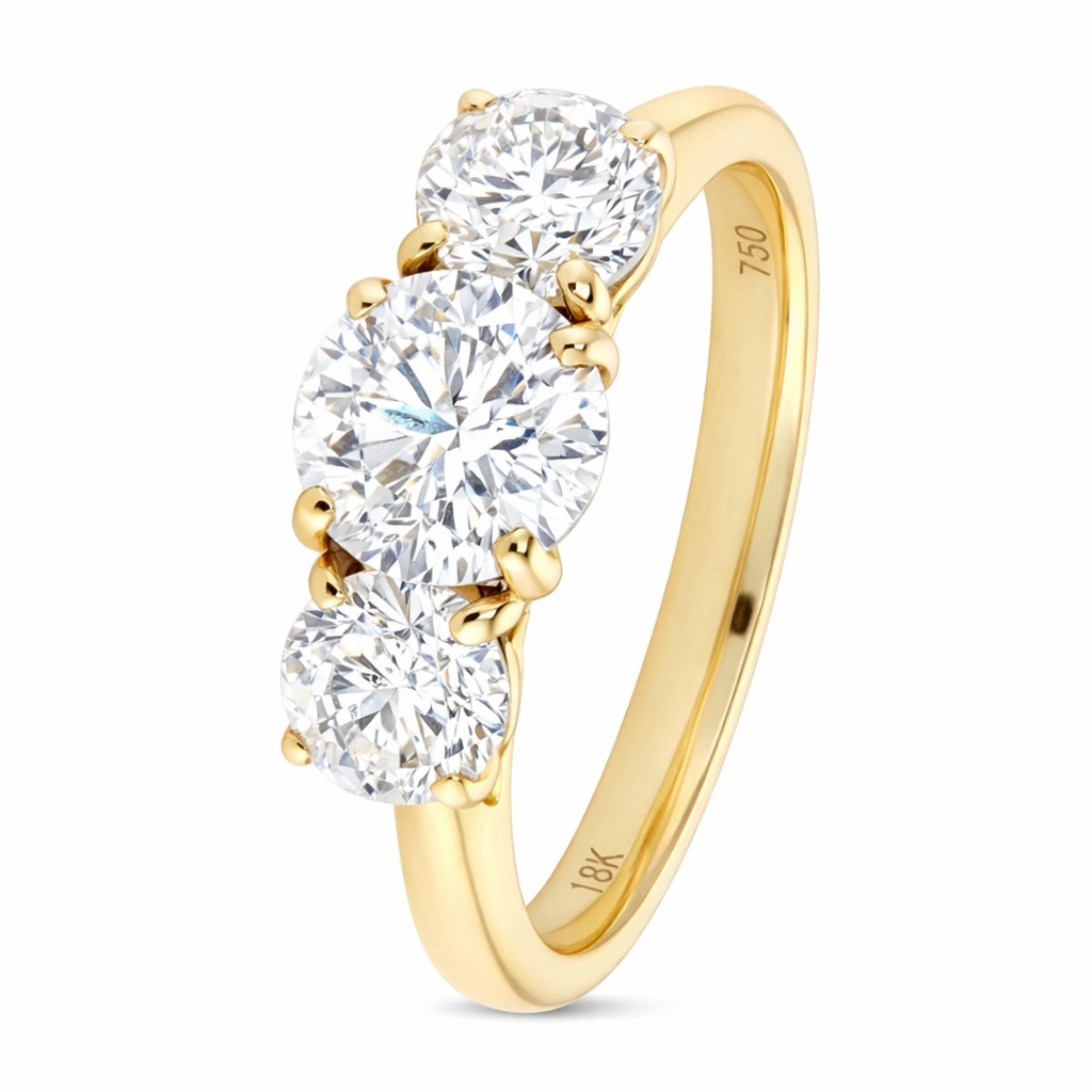 A brand-new, unused, certified 18ct yellow and white gold natural diamond three-stone eternity ring, this exquisite piece is a radiant expression of timeless elegance and craftsmanship. At its heart lies a striking 0.71ct brilliant-cut diamond, graded I1 for clarity and G for colour, showcasing a warm brilliance that draws attention effortlessly. Complementing the centre stone are two dazzling side diamonds with a combined weight of 0.80ct, graded SI2-I1 for clarity and F-G for colour, creating a harmonious trio of sparkle and sophistication.