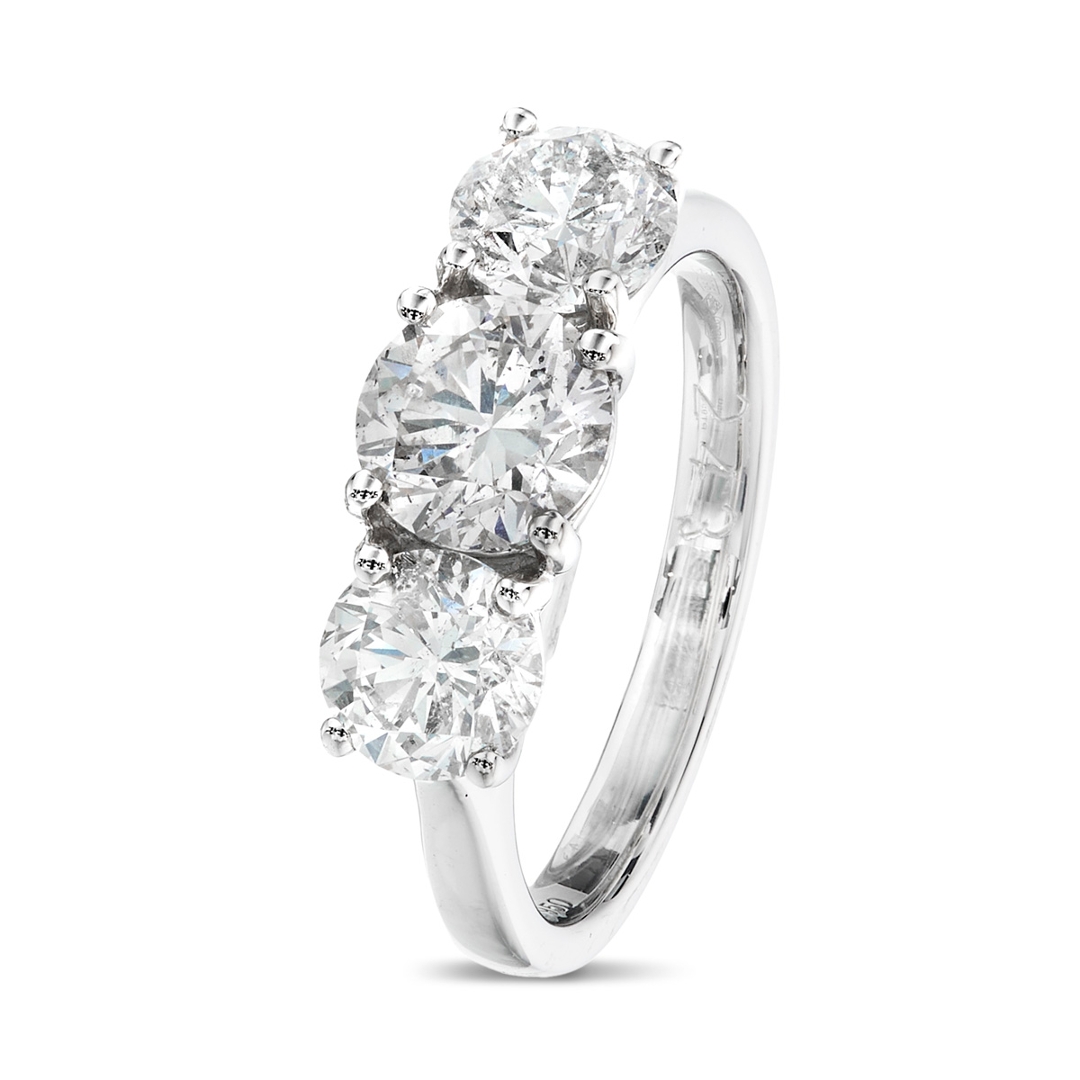 A brand new, unused certified natural diamond three-stone eternity ring that radiates timeless sophistication, brilliance and symbolic beauty. This exquisite piece showcases three magnificent, brilliant-cut natural diamonds, totalling 2.43ct, each meticulously chosen for its exceptional sparkle and fire. The diamonds are graded F–G in colour and SI1–SI2 in clarity, displaying an extraordinary balance of purity and radiance. Expertly set in luxurious platinum, the setting enhances the natural brilliance of each stone while providing strength, durability and a refined aesthetic. With a professional valuation of £9,100, this ring is a true reflection of fine craftsmanship, elegance and enduring value. Weighing 6.14 in grams.