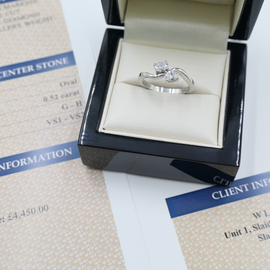 A brand-new, unused certified natural diamond two-stone cluster ring, exquisitely crafted in platinum. This refined and timeless piece features two oval-cut natural diamonds, totalling 0.52 carats and displaying exceptional brilliance and symmetry. The diamonds, graded G-H in colour and VS1–VS2 in clarity, radiate a bright and captivating sparkle that symbolises unity and everlasting love. The cool sheen of the platinum setting enhances their natural luminosity, providing both strength and elegance in a design that feels effortlessly sophisticated and enduringly modern.