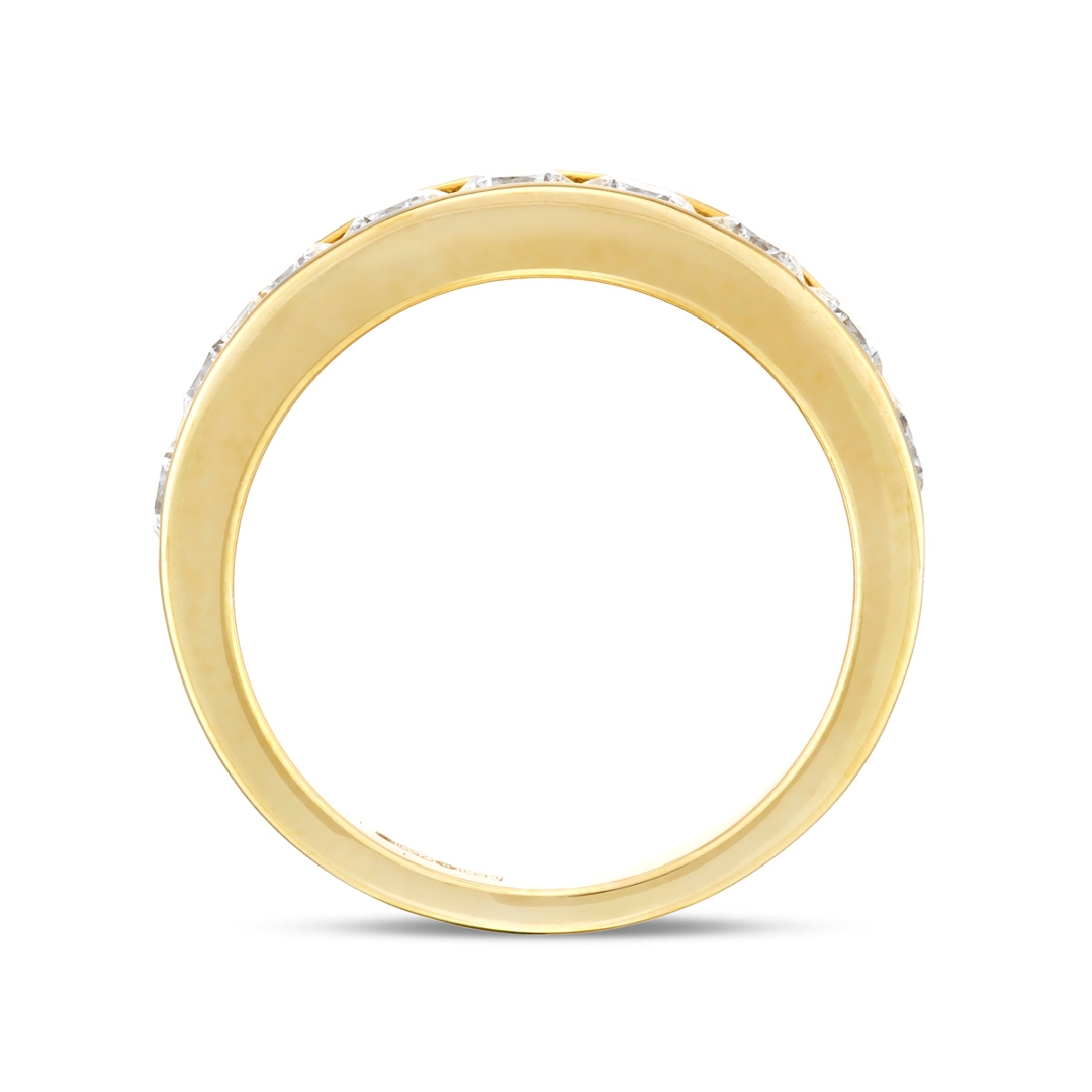 A brand-new, unused certified natural diamond wedding ring, set with nine brilliant-cut diamonds totalling 1.67ct, all beautifully mounted in 18ct yellow gold. The diamonds are well matched, exhibiting a bright G–H colour and clarity ranging from VS2 to SI1, producing a lively and consistent sparkle. The warm tone of the yellow gold contrasts elegantly with the brilliance of the stones, while the evenly spaced arrangement creates a continuous line of light that offers both presence and timeless appeal on the hand.