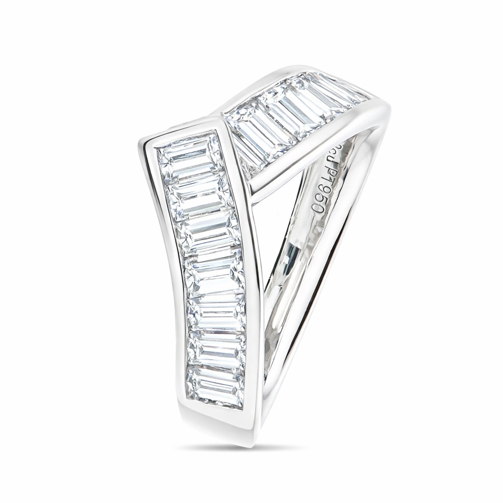 A brand new, unused, certified natural diamond wishbone cluster ring, with tapered baguette cut diamonds, set in platinum.