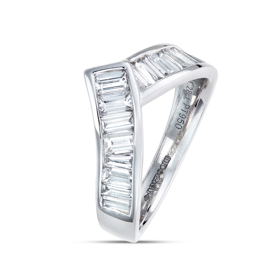 A brand new, unused, certified natural diamond wishbone cluster ring, with tapered baguette cut diamonds, set in platinum.