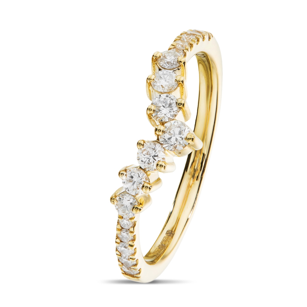 A brand-new, unused certified natural diamond wishbone eternity ring, set with a cluster of brilliant-cut diamonds in 18ct yellow gold. With a total diamond weight of 0.41 ct, the design offers a graceful and distinctive silhouette, with the wishbone shape naturally contouring to the finger or pairing seamlessly with another ring. The clustered diamonds enhance overall brilliance, creating a concentrated, eye-catching display of light, while the warm yellow gold setting adds richness and a timeless appeal.