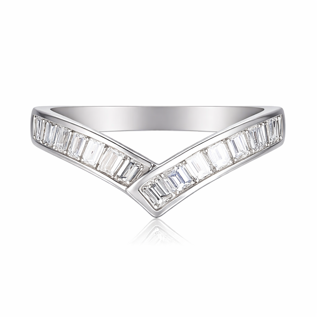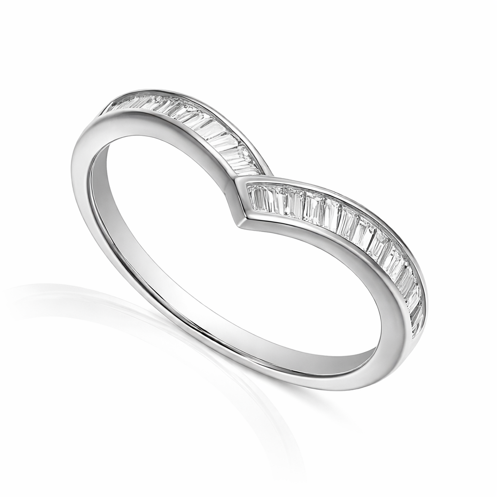 A brand-new, unused certified platinum wishbone eternity ring that radiates elegance, set with 0.98ct of natural baguette-cut diamonds. The graceful wishbone design offers both individuality and symbolism, often representing luck, unity, or new beginnings. The sleek arrangement of baguette-cut diamonds enhances the fluid shape, creating clean lines and a sense of understated sophistication. Crafted in platinum, this ring is made to endure, ensuring lasting strength while maintaining its refined brilliance.