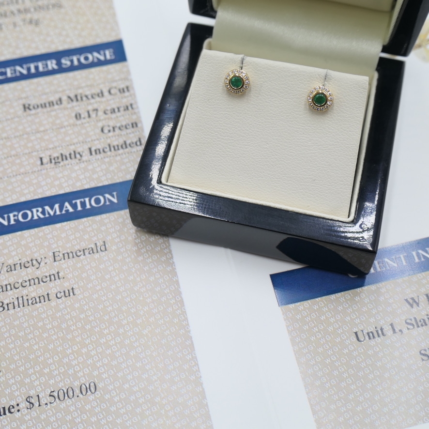 - > Natural Emerald 0.17ct & Diamond 0.08ct Round Shaped Cluster Earrings