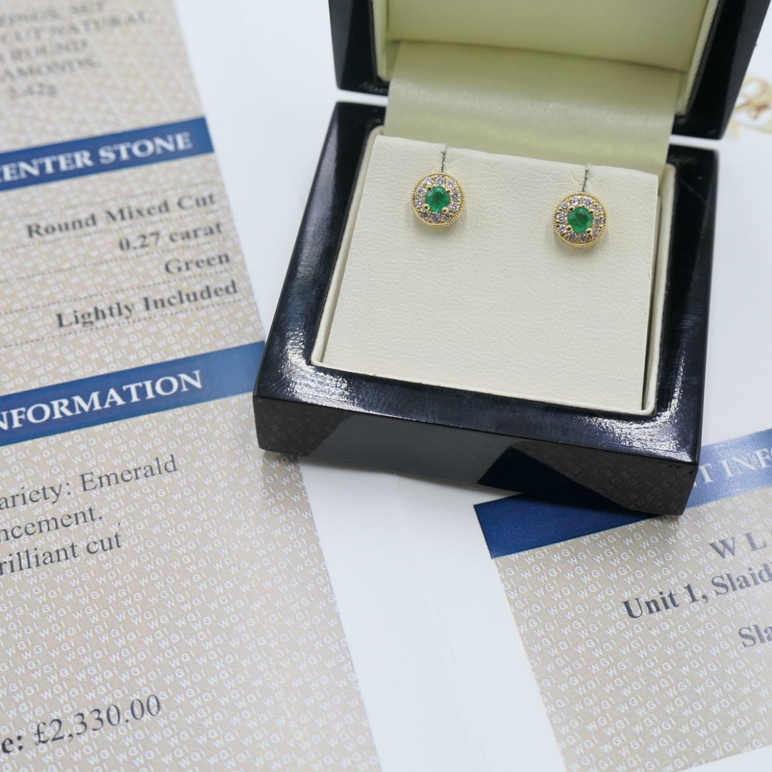 A brand-new, unused, certified pair of 18ct yellow gold natural diamond and emerald round-shaped cluster earrings, these radiant pieces offer a timeless blend of vibrant colour and classic sparkle. At the heart of each earring sits a beautifully matched round mixed-cut emerald, totalling 0.27ct, showcasing a lush green hue that symbolises growth, elegance, and enduring beauty. Surrounding each emerald is a delicate halo of brilliant-cut natural diamonds, totalling 0.18ct in weight. Graded VS2 to SI1 in clarity and F to G in colour, the diamonds offer a bright, clean sparkle that perfectly complements the rich tone of the emeralds.