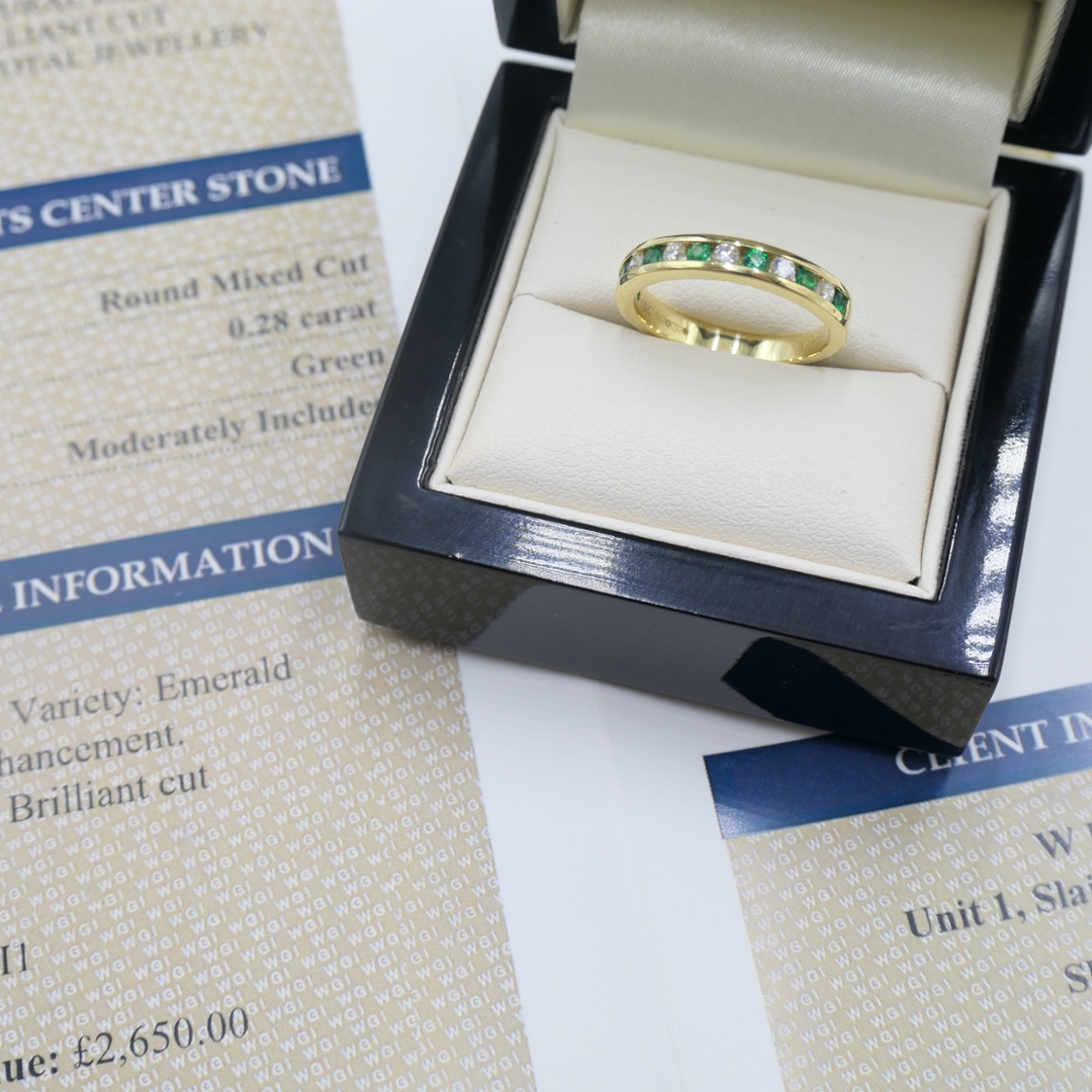 A brand-new, unused, certified 18ct yellow gold eternity ring beautifully crafted to showcase the timeless elegance of genuine natural gemstones. The ring is set with seven vivid green round mixed-cut emerald gemstones, totalling 0.28ct, prized for their vibrant colour and natural depth. Alternating gracefully with these emeralds are six sparkling, brilliant-cut natural diamonds, each weighing 0.28ct, meticulously selected for clarity grades of VS2-SI1 and an attractive colour range of G-H. These diamonds enhance the emeralds' beauty, capturing and reflecting light with every movement.