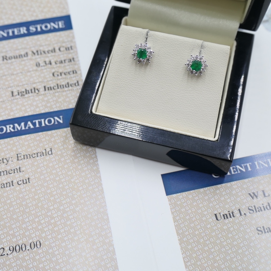 A brand-new, unused, certified pair of 18ct white gold natural diamond and emerald cluster earrings, these exquisite pieces are a testament to timeless elegance and rich, vibrant colour. Each earring features a beautifully set round mixed-cut emerald at the centre, with a combined gemstone weight of 0.34ct. The emeralds display a vivid green hue, symbolising renewal, vitality, and classic sophistication. Surrounding each emerald is a radiant halo of brilliant-cut natural diamonds, totalling 0.30ct, graded between VS2 and SI1 in clarity and G to H in colour. The diamonds deliver a bright, lively sparkle that enhances the depth and vibrancy of the emeralds.