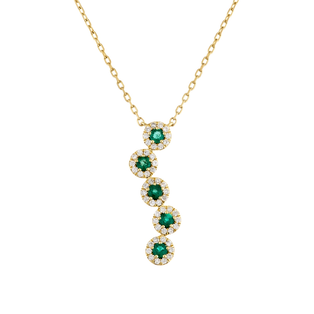 A brand-new, unused, certified natural diamond & emerald gemstone droplet cluster pendant, set with six round mixed-cut emerald gemstones at the centre & a cluster of brilliant-cut diamonds in a halo setting, set in 18ct yellow gold.
